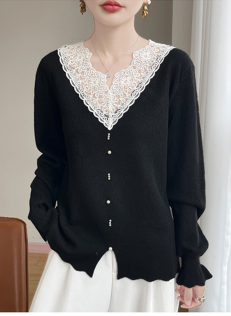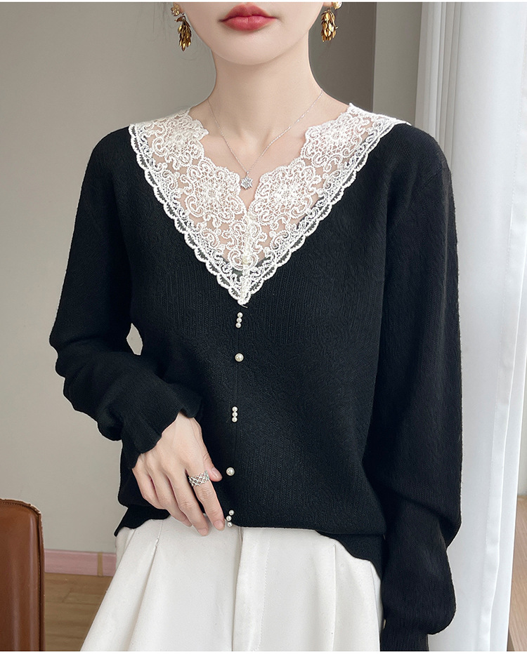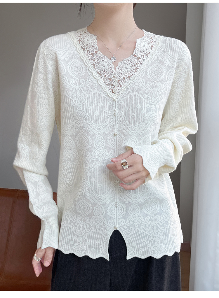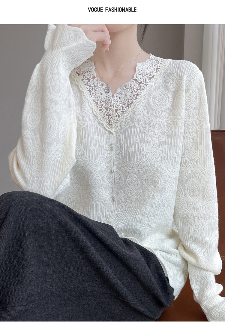 法式时尚V领高级感镂空蕾丝针织打底衫女25新款秋冬内搭保暖毛衣