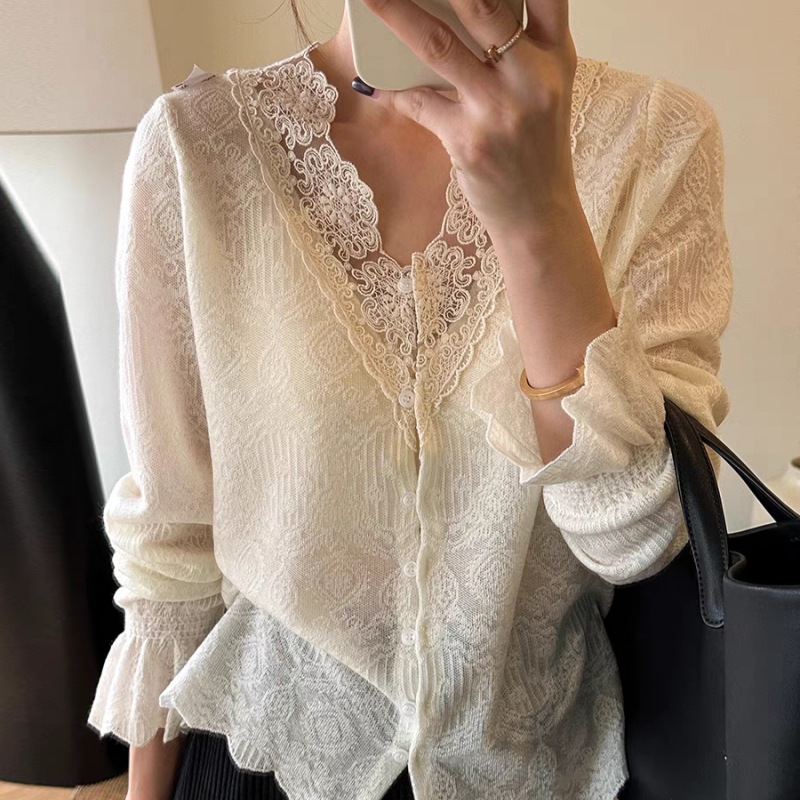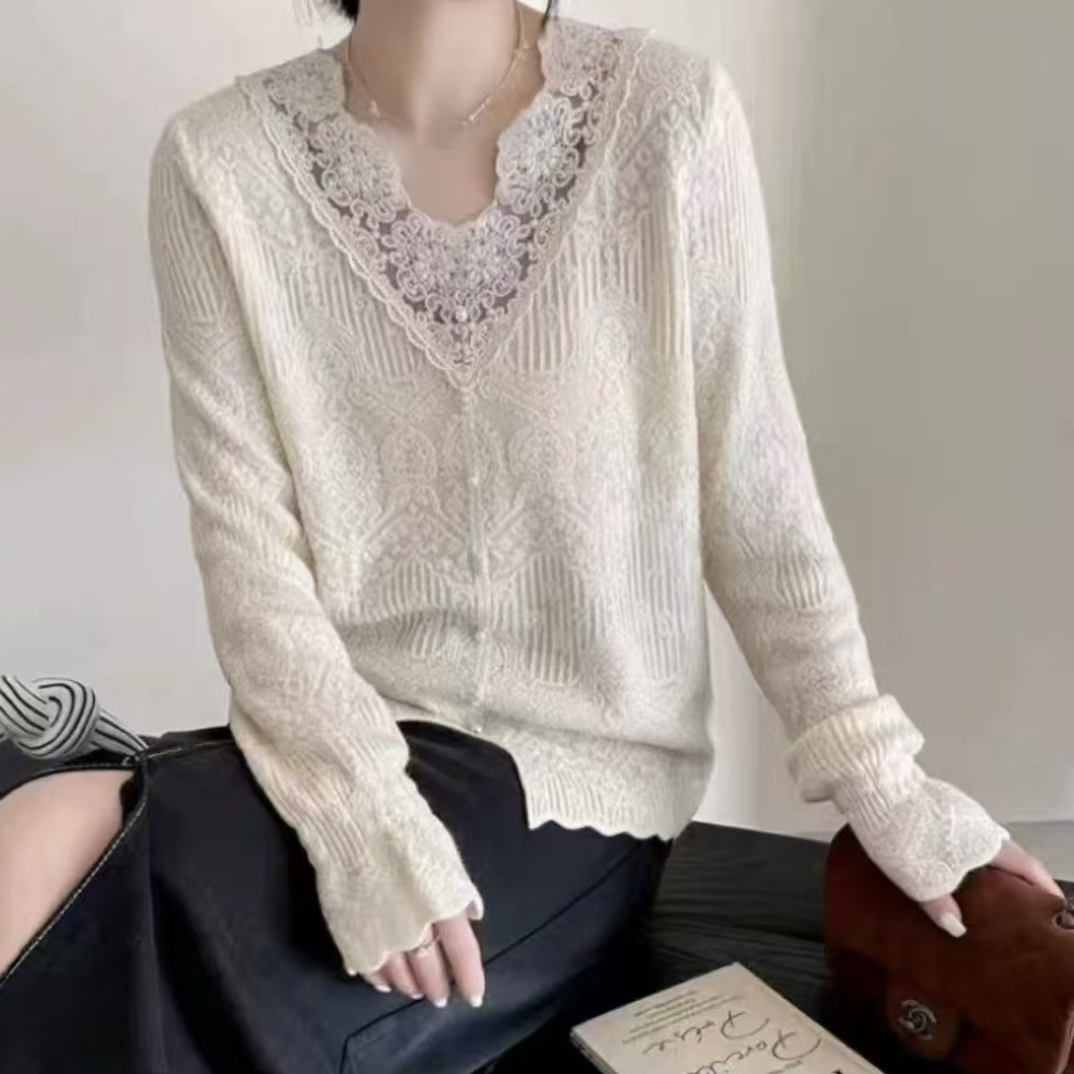 フランスvネックレースニット女性2025春の新しいファッション気質減齢上着