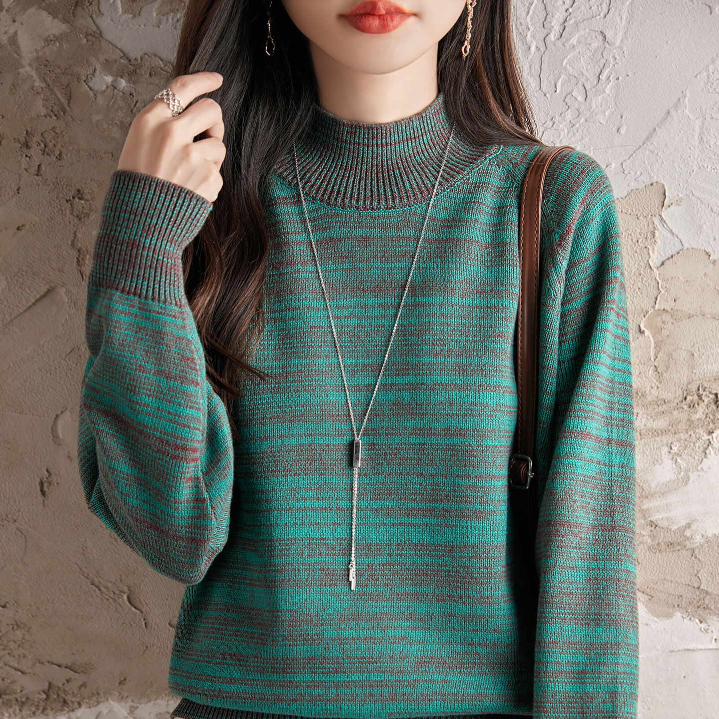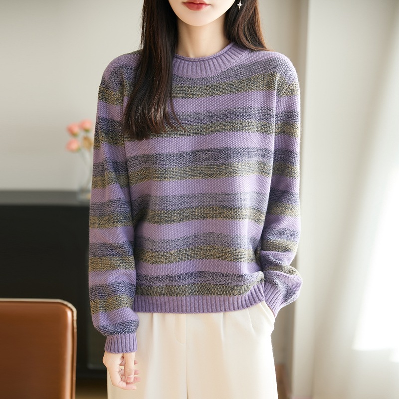 2025秋冬新款半高花纱针织衫女宽松条纹毛衣女士女装时尚长袖上衣