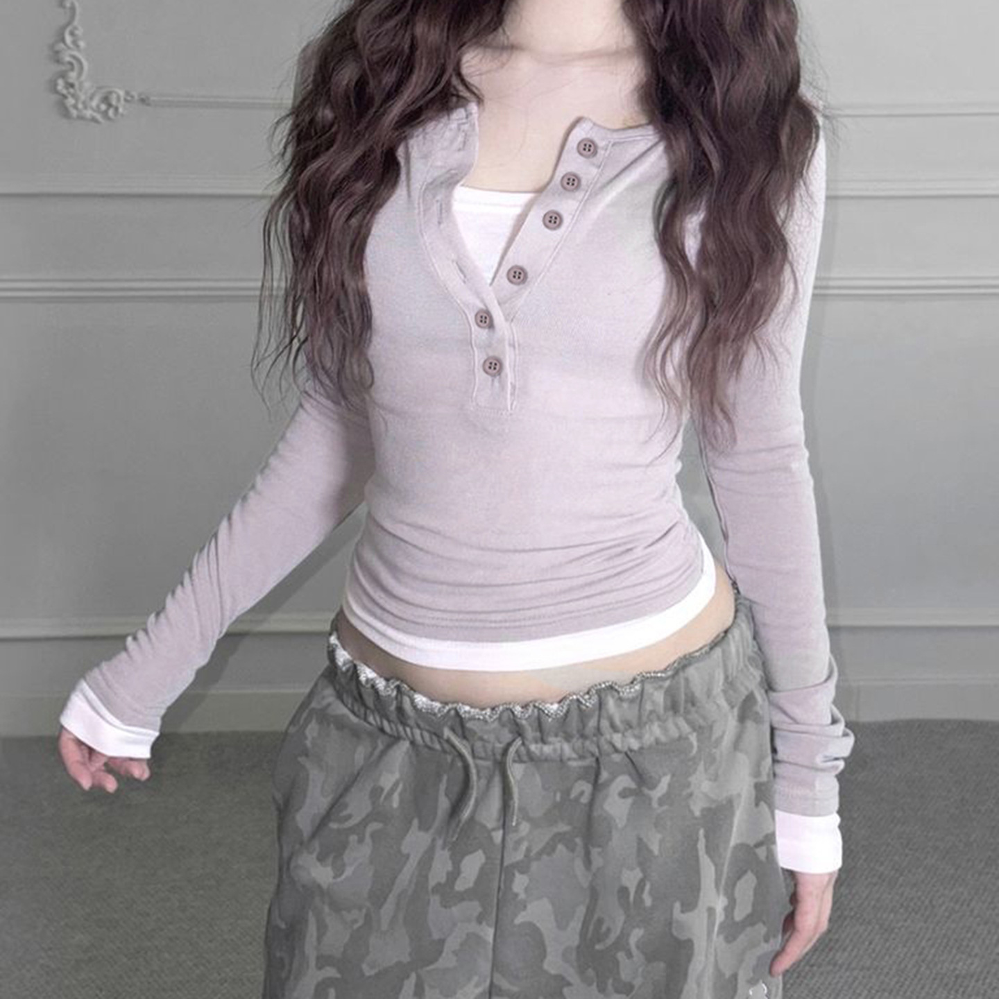 韩系ins简约休闲假两件设计长袖t恤气质百搭日常修身显瘦辣妹上衣