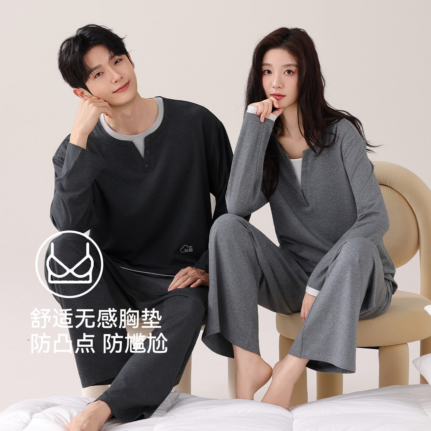 带胸垫情侣睡衣女春秋季长袖新款柔软莫代尔棉家居服男士大码套装