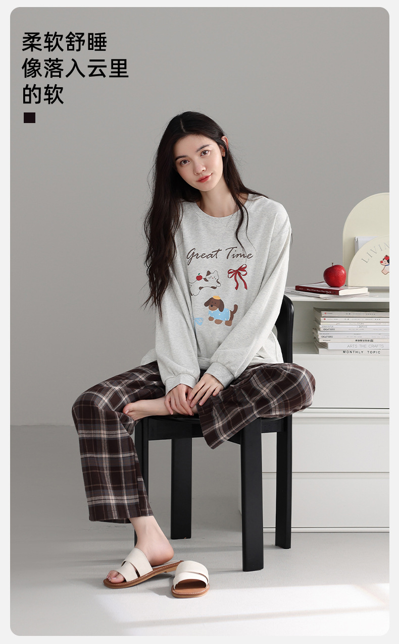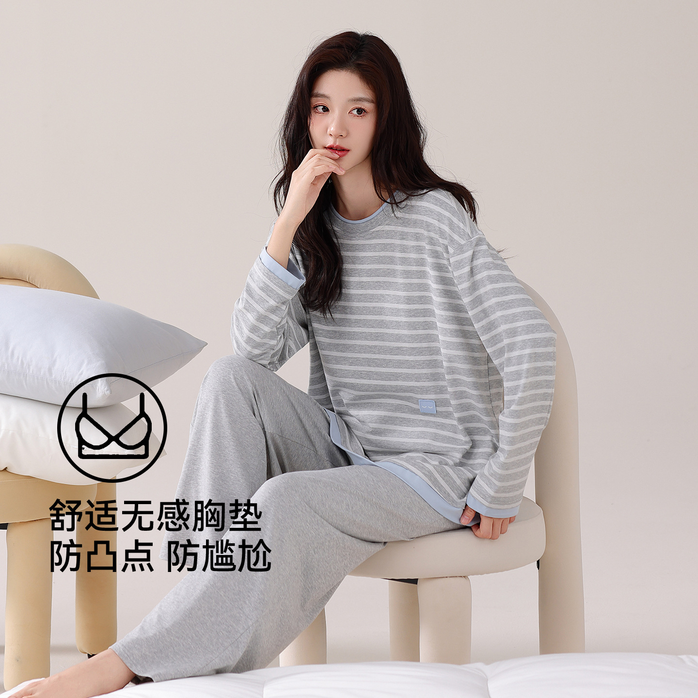 带胸垫纯棉睡衣女2025年新款春秋季圆领长袖可外穿休闲家居服套装