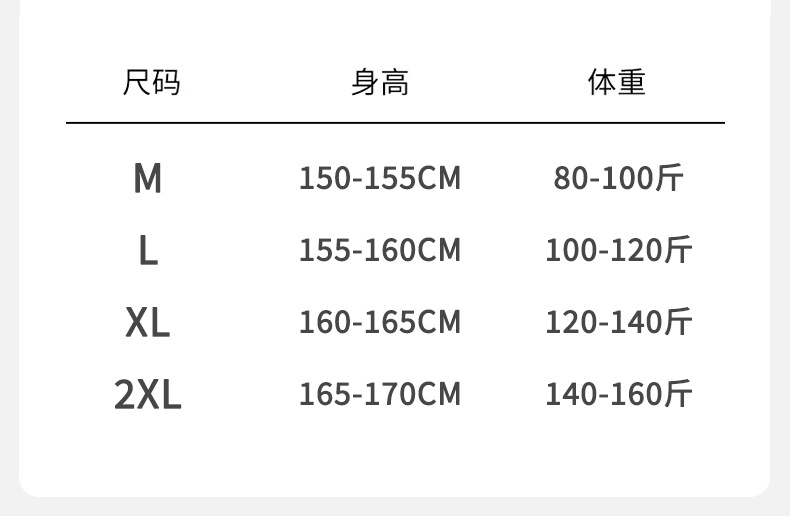 尺码 M建议80-100斤,L建议100-120斤,XL建议120-140斤,XXL建议140-160斤