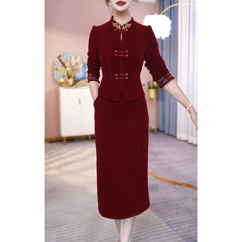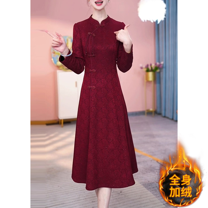 加绒加厚长袖连衣裙女5新秋冬喜婆婆婚宴旗袍礼服配大衣裙子
