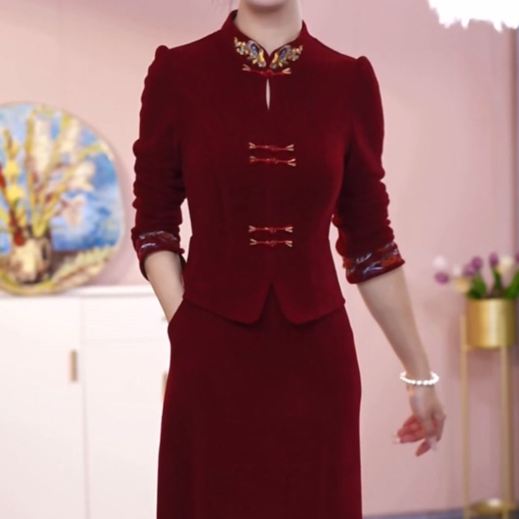 婚約ドレスの毛は、国風秋冬新中国式の赤い上着の2つのセットの婚約領収書のチャイナドレスのドレスのドレスです。