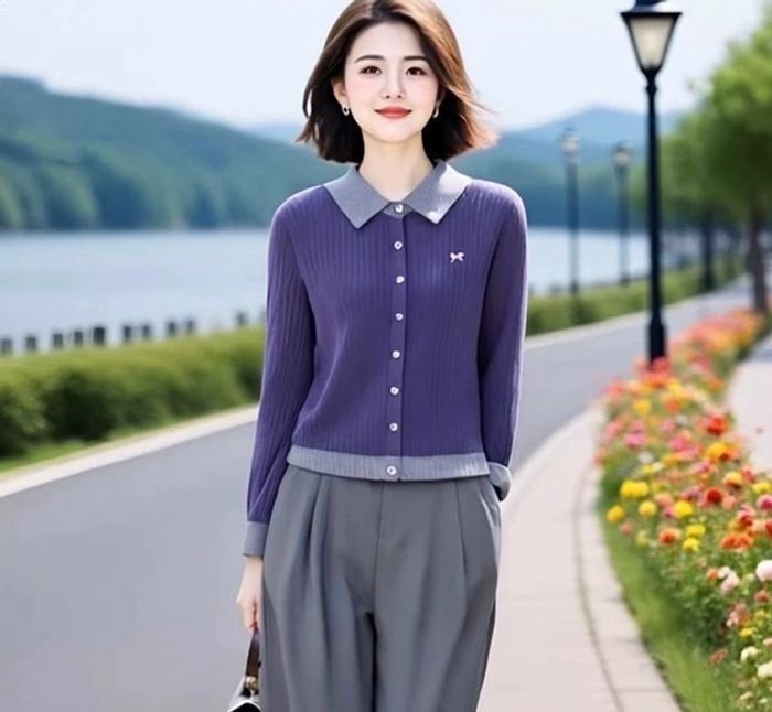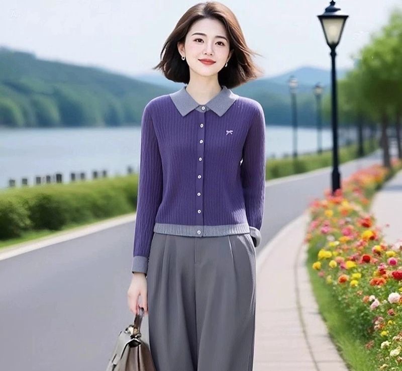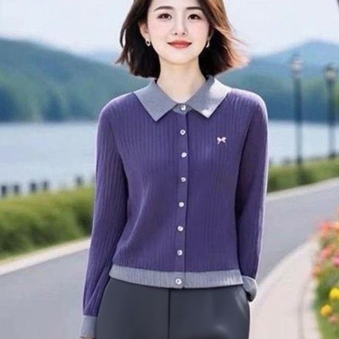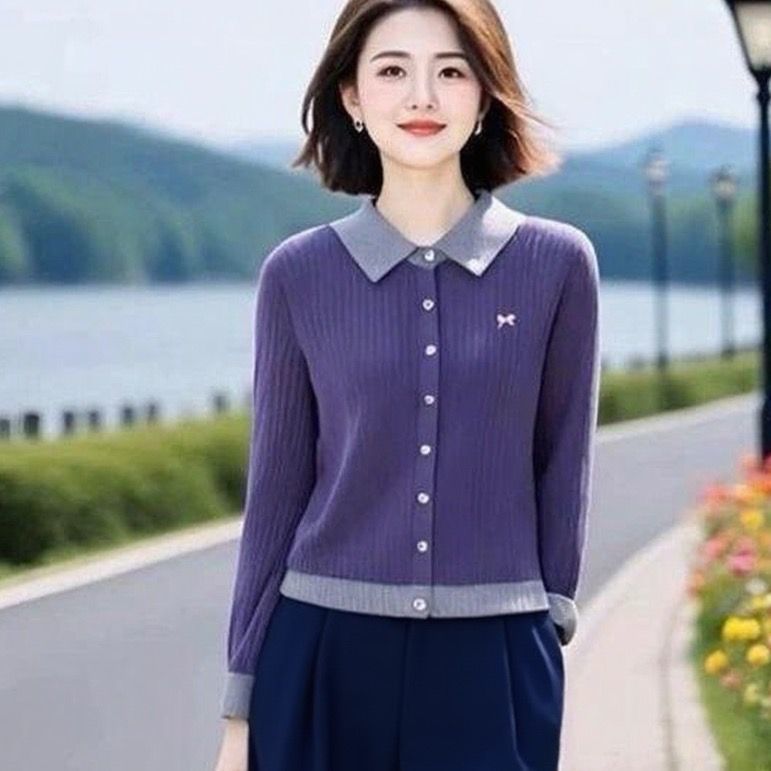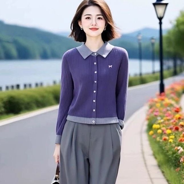 新款2025春秋季假两件针织翻领宽松针织衫打底显瘦毛衣洋气上衣