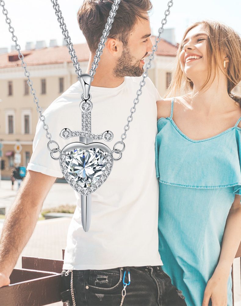 卡漫其 欧美时尚创意一箭穿心吊坠情侣颈链铜镶锆爱心匕首套装
