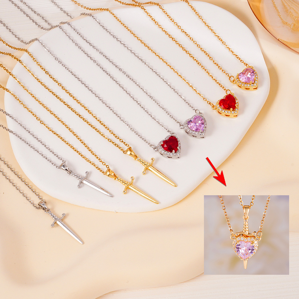TKハートと剣のネックレス2点セット、銅にジルコニウムを象嵌した一矢貫心カップルネックレス、ステンレス真空ゴールド