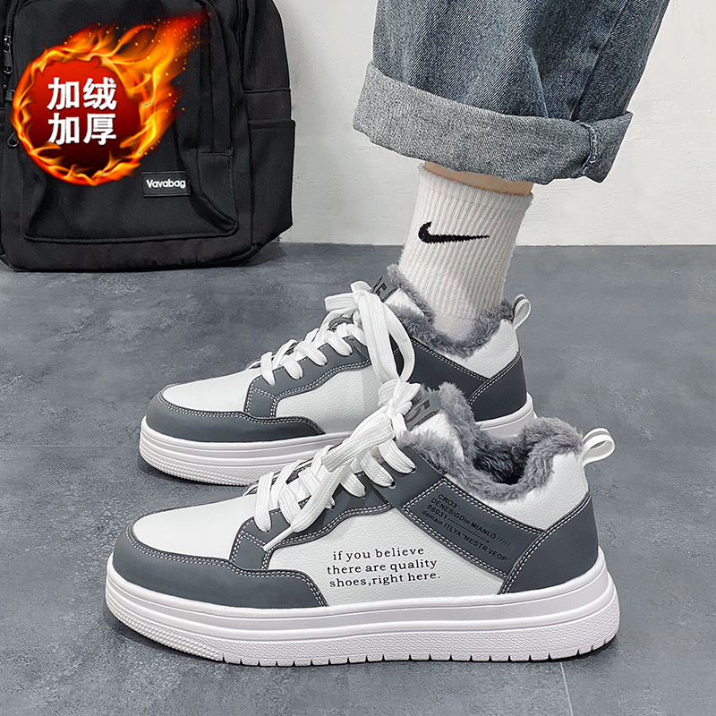 2024年冬用メンズ白スニーカー、裏起毛・厚底、防寒・滑り止め、スポーツシューズ、韓国風トレンド