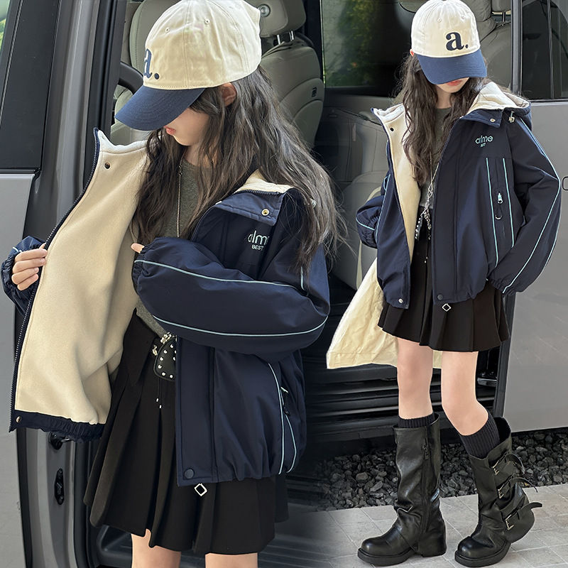 女童加绒外套2025秋冬新款大童韩版休闲加厚保暖连帽拉链衫风衣