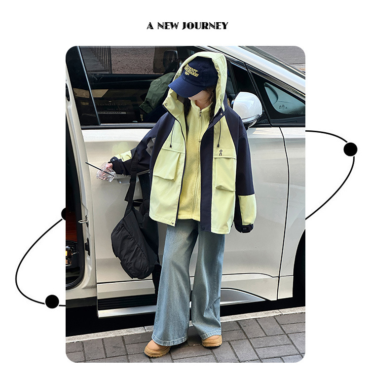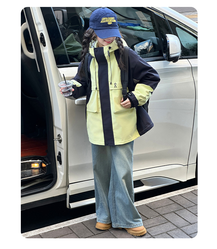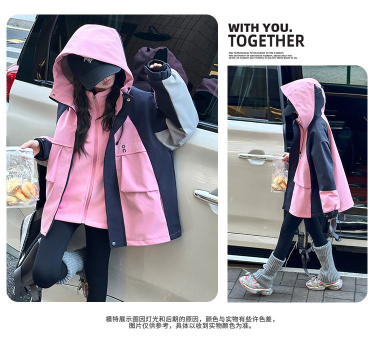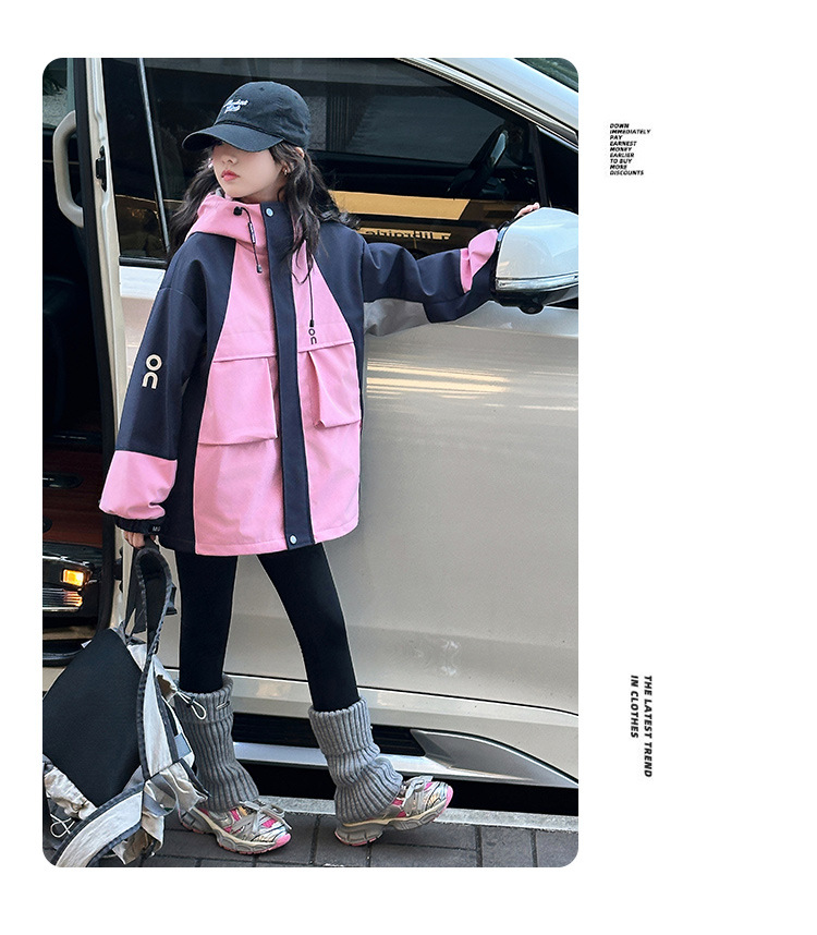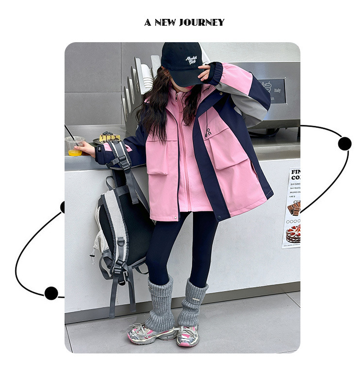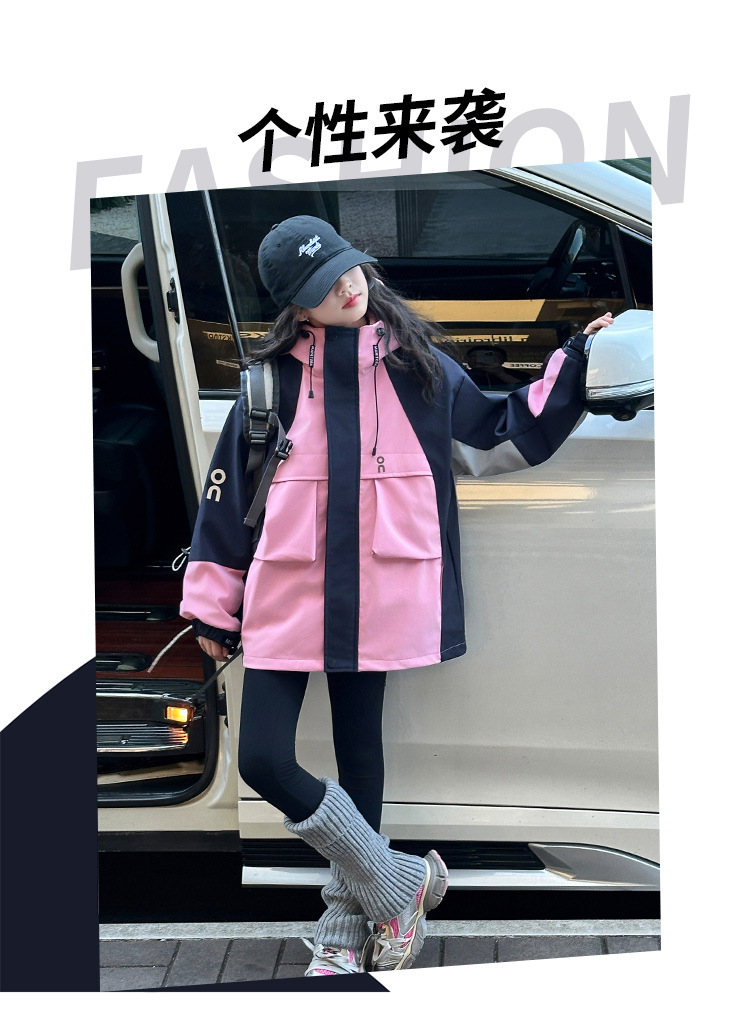女童加绒冲锋衣2025秋新款大童时髦洋气撞色户外加厚百搭休闲外