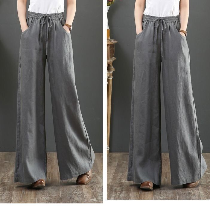 2024 春夏文学ピュアリネン感触の女性のパンツルーズ大きいサイズワイドレッグパンツハイウエストフロアレングスパンツ