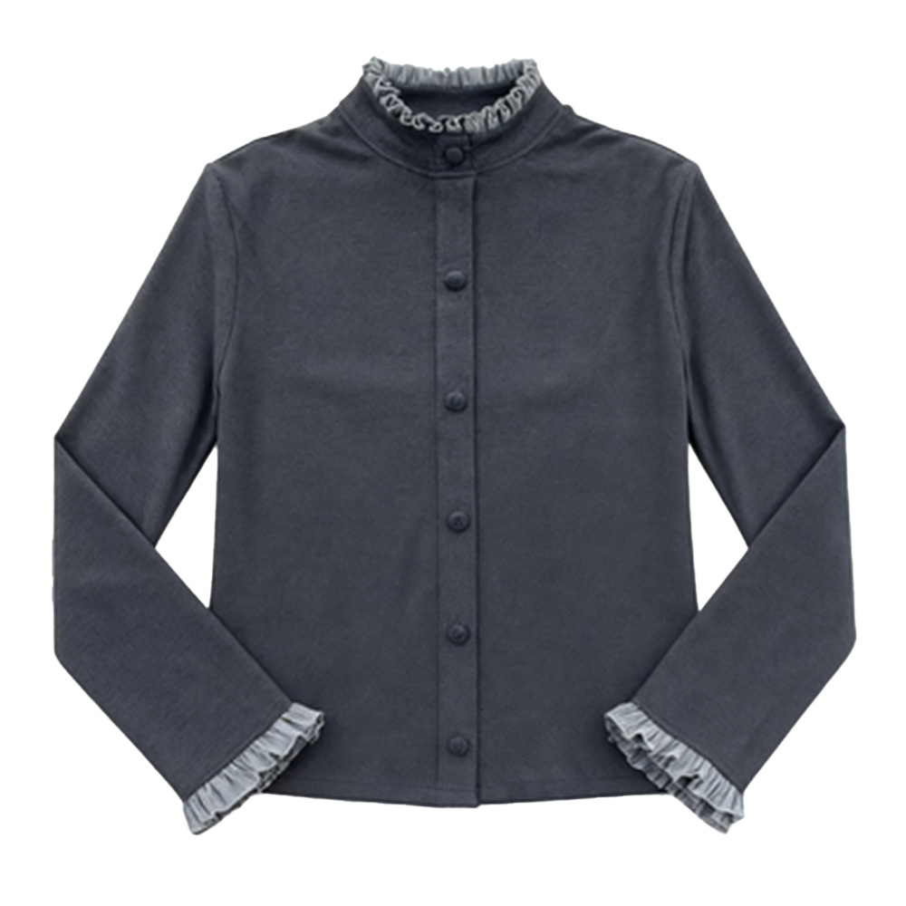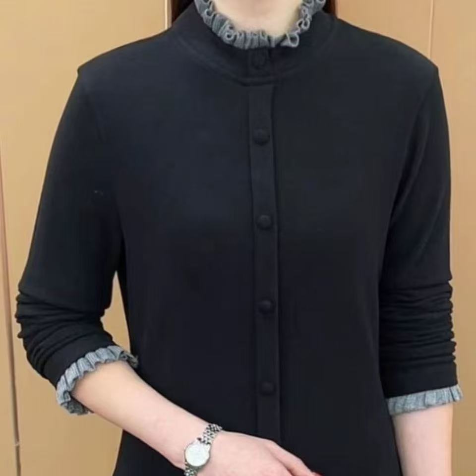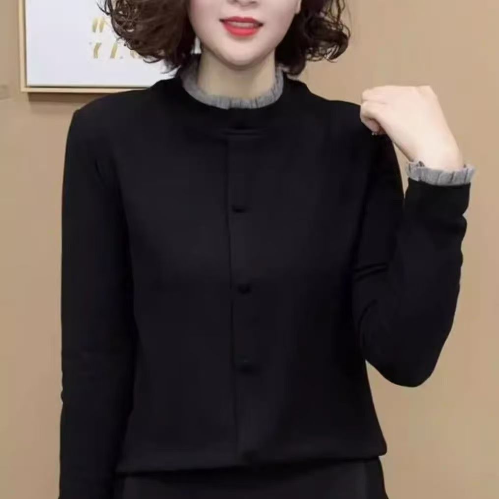 新款秋冬时尚半高领长袖纽扣设计荷叶领保暖衫遮肚中老年妈妈上衣