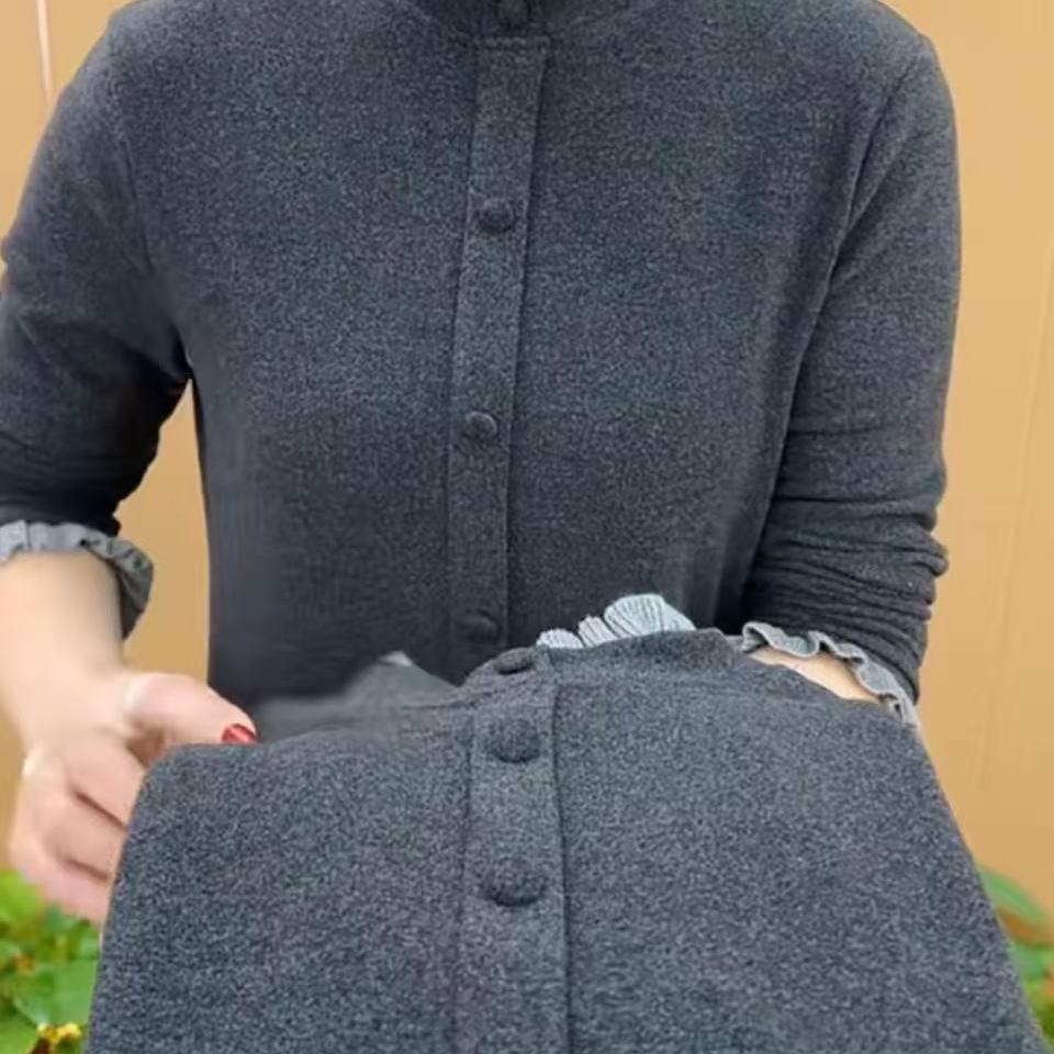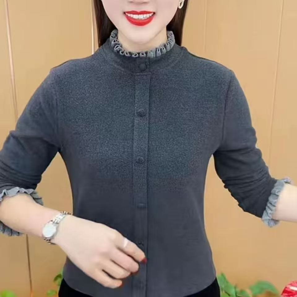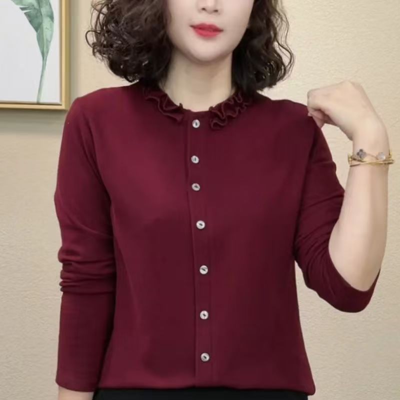 秋冬新款时尚单排扣荷叶领长袖减龄遮肚气质打底衫妈妈装保暖上衣