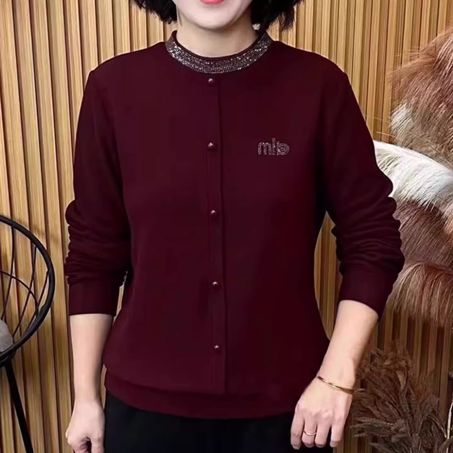 秋冬新款圆领烫钻长袖时尚大码女装妈妈上衣遮肚显瘦纽扣打底衫