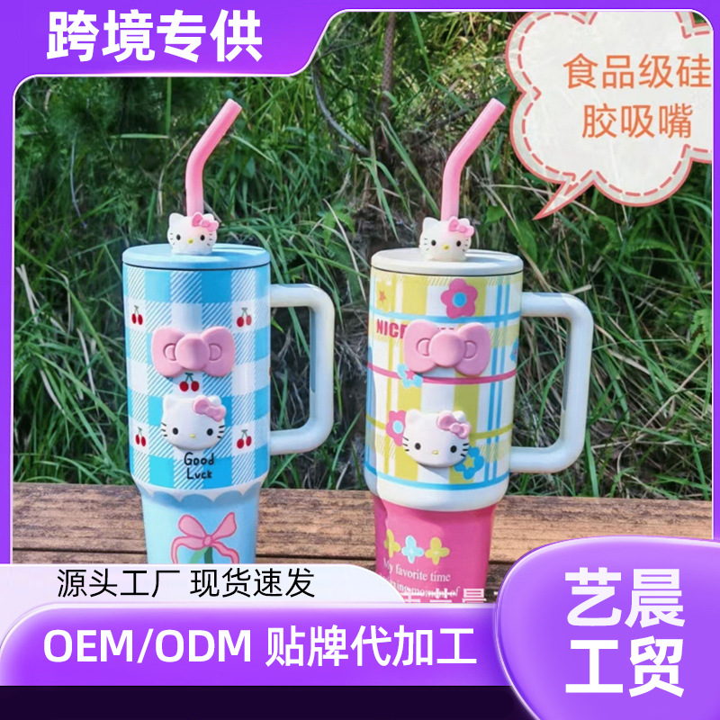 新型クロスボーダー大容量保温カップ高颜値漫画ストローカップハンドル付き304ステンレス保温カップ