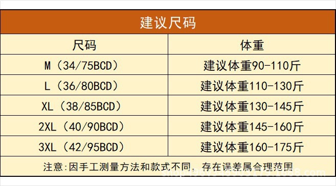 尺码 M码34/75BCD,L码36/80BCD,XL码38/85BCD,2XL码40/90BCD,3XL码42/95BCD,4XL
