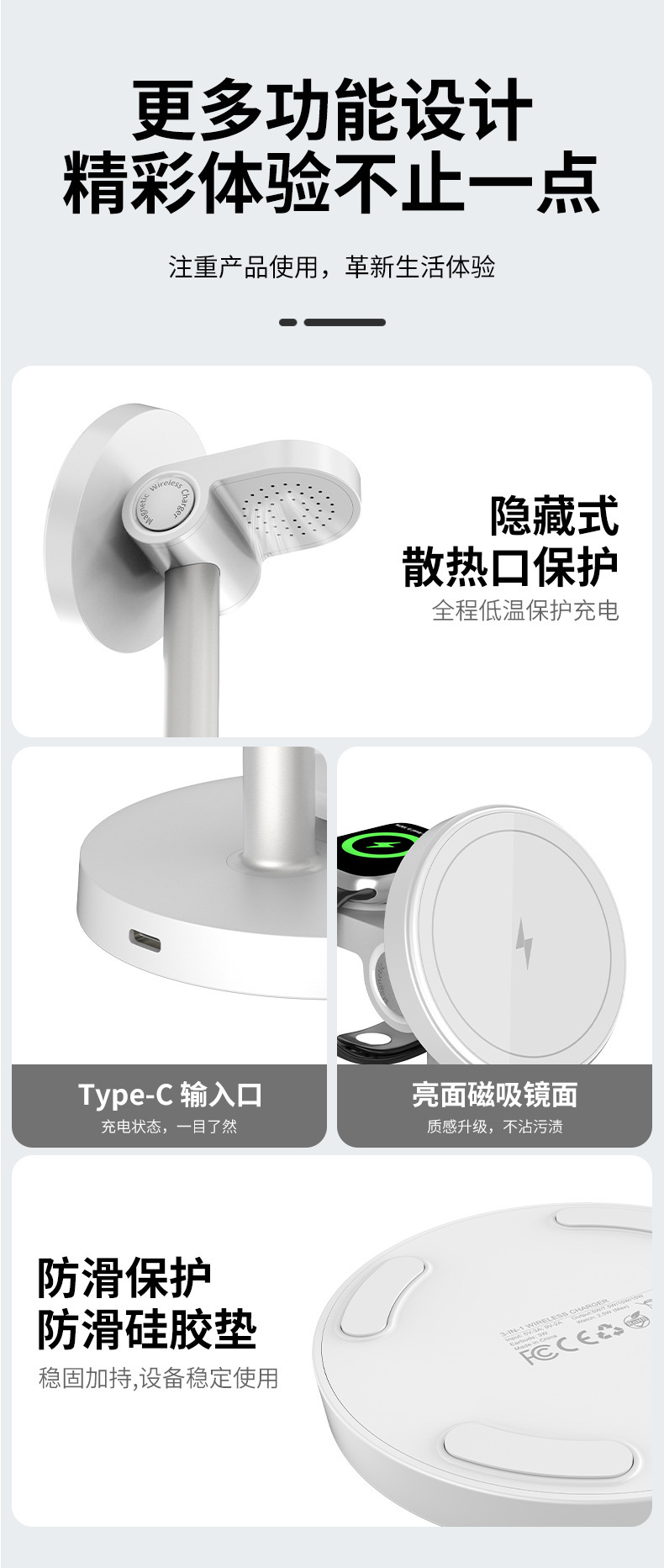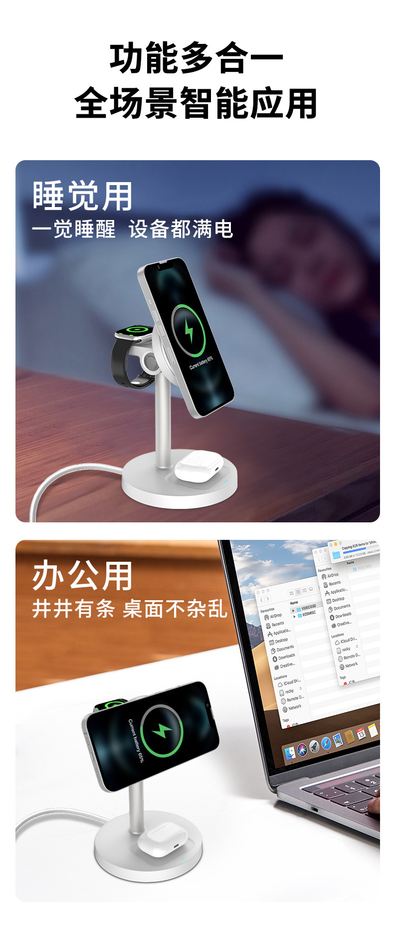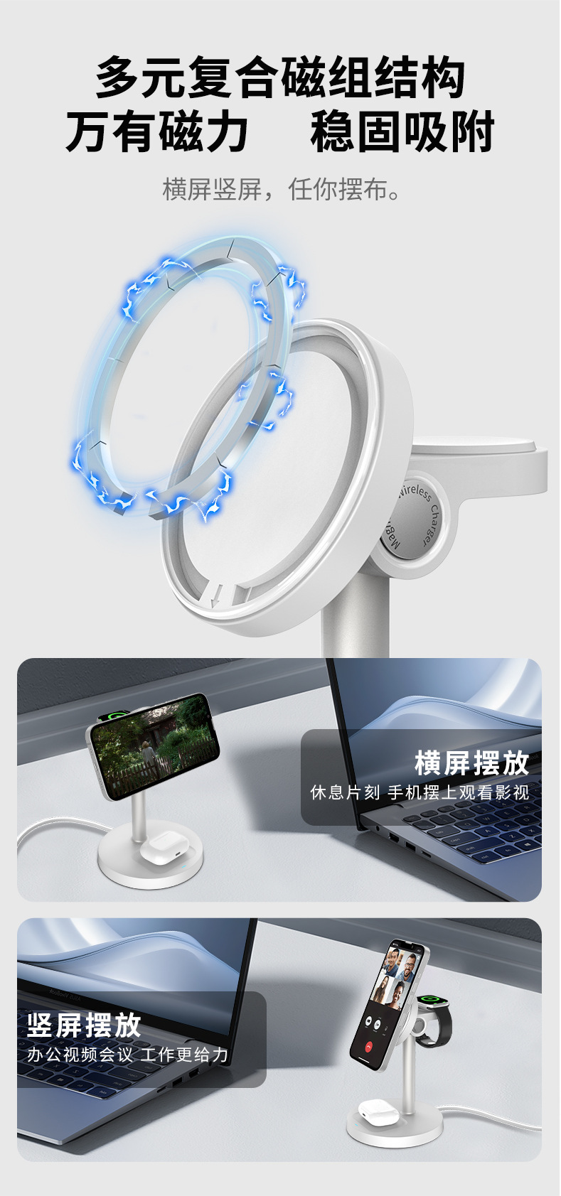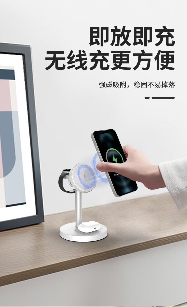 桌面三合一无线充电器15W快充强力磁吸适用苹果充电底座手机支架
