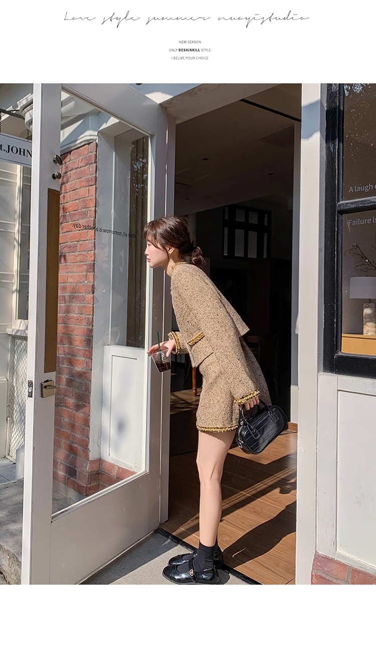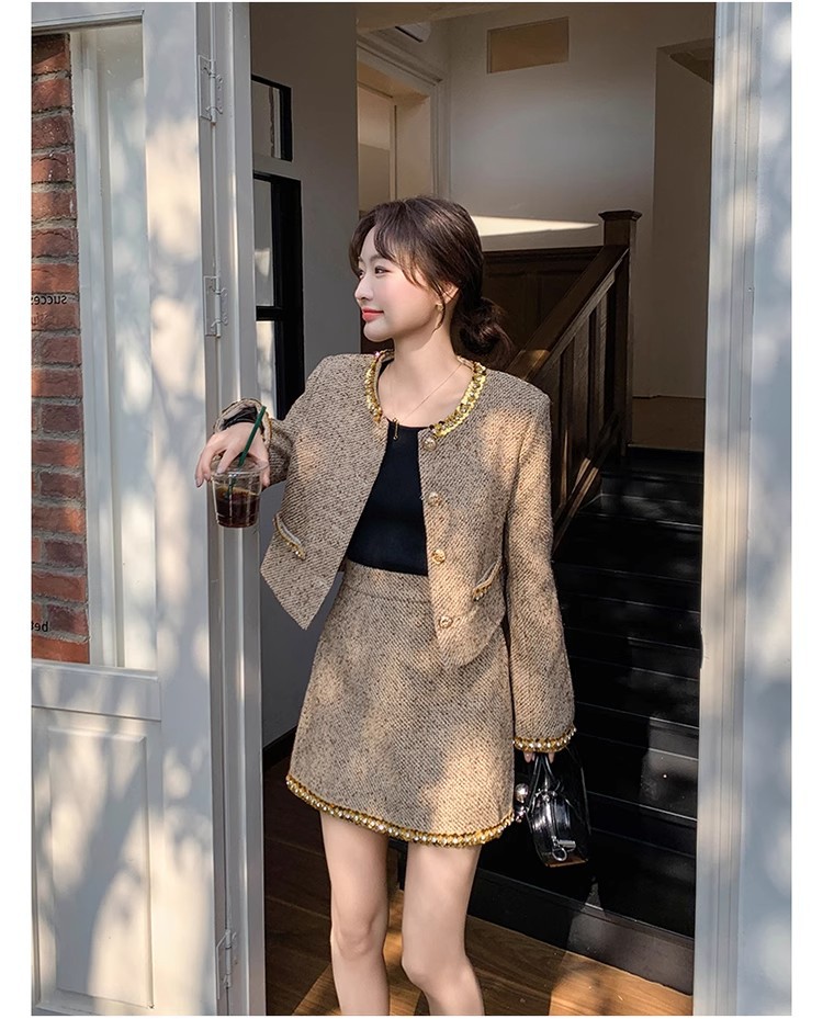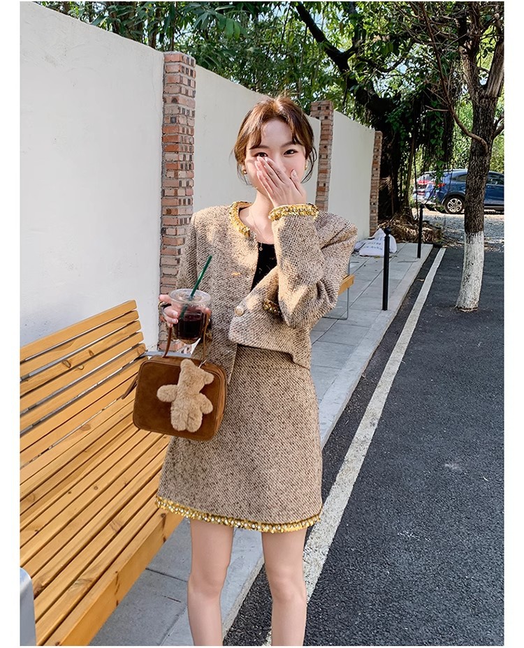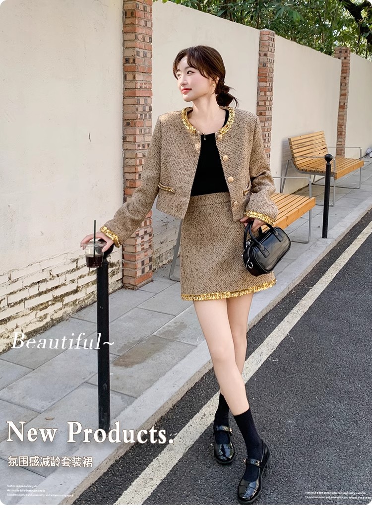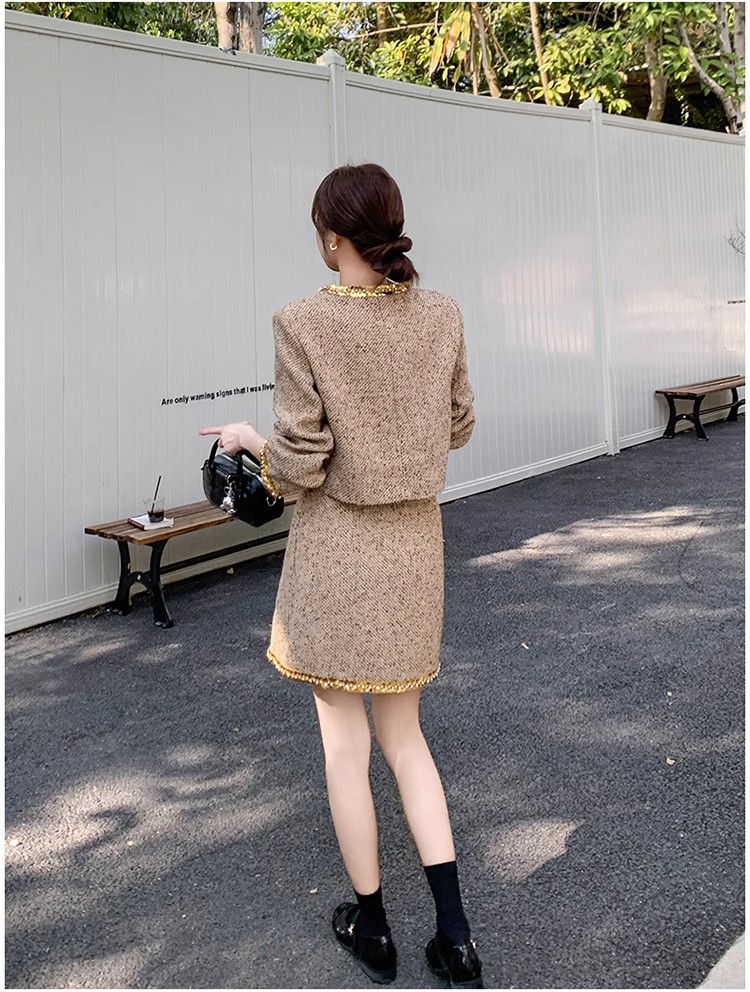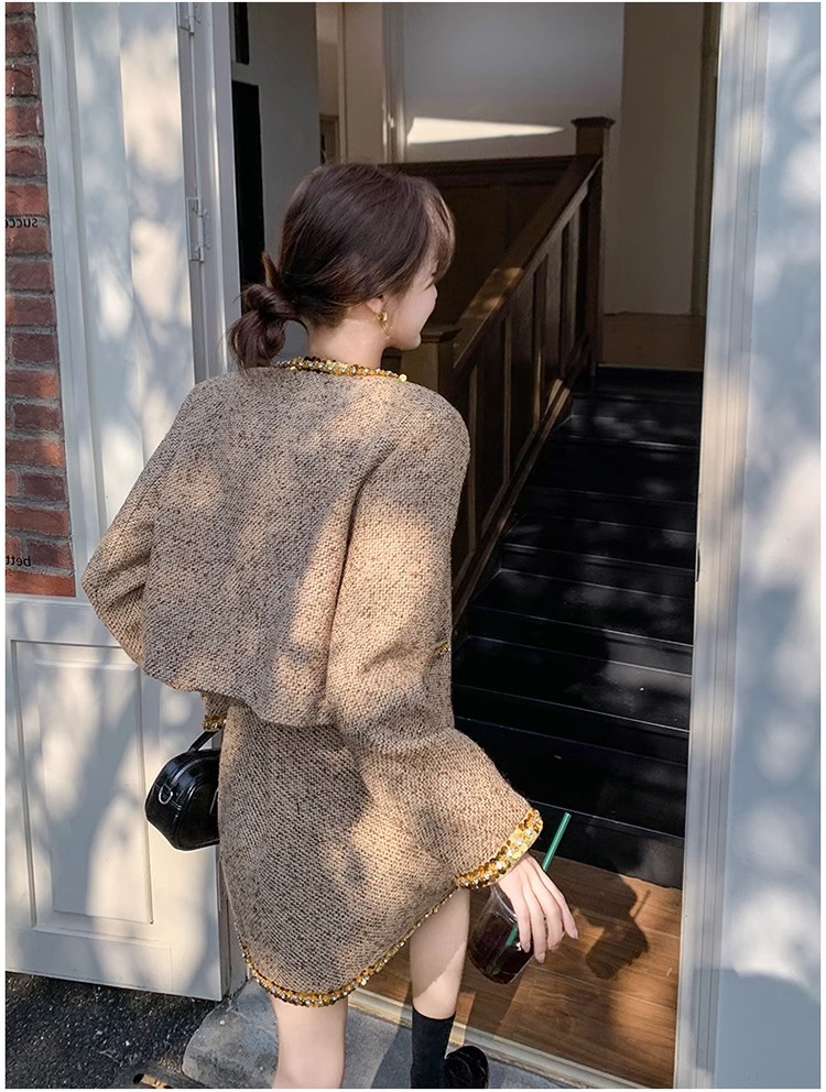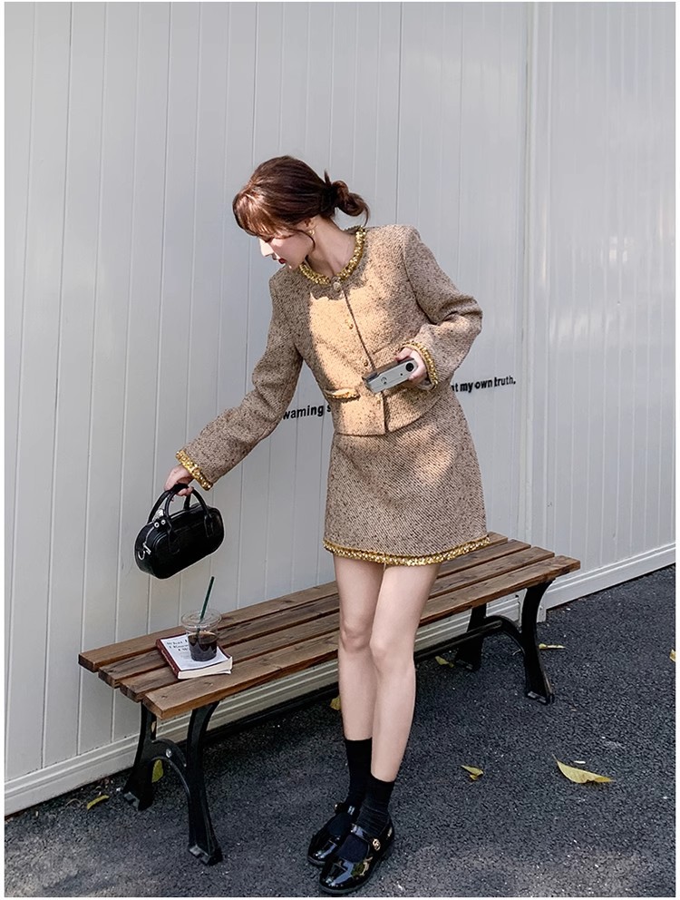 法式短款小香风套装粗花呢亮片长袖短外套秋冬包臀半身裙两件套