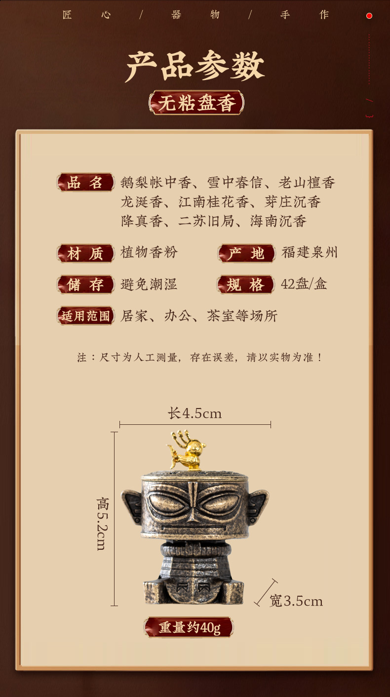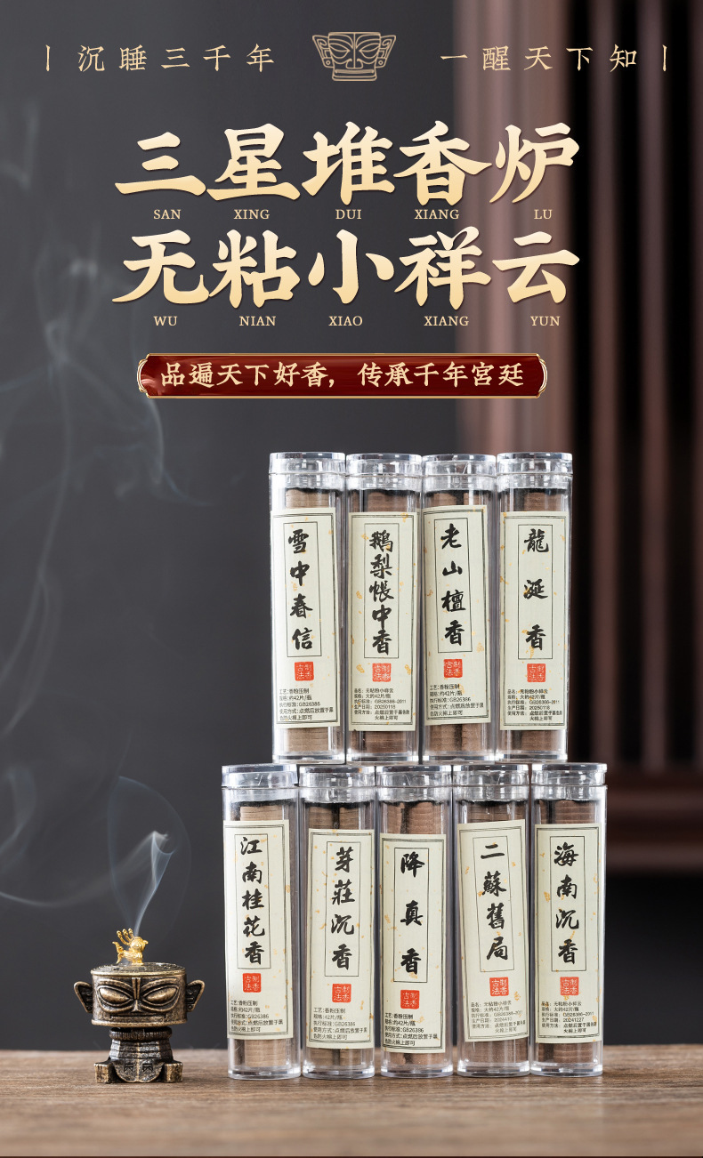 规格 三星堆-小香炉【青铜色】,三星堆+42片/小祥云【鹅梨帐中香】,三星堆+42片/小祥云【老山檀香】,三星堆+42片/小祥云【芽庄沉香】,三星堆+42片/小祥云【江南桂花香】,三星堆+42片/小祥云【龙涎香】,三星堆+42片/小祥云【海南沉香】,三星堆+126片/3瓶【鹅.桂.檀】,三星堆+210片/5瓶【鹅.龙.沉.檀.桂】