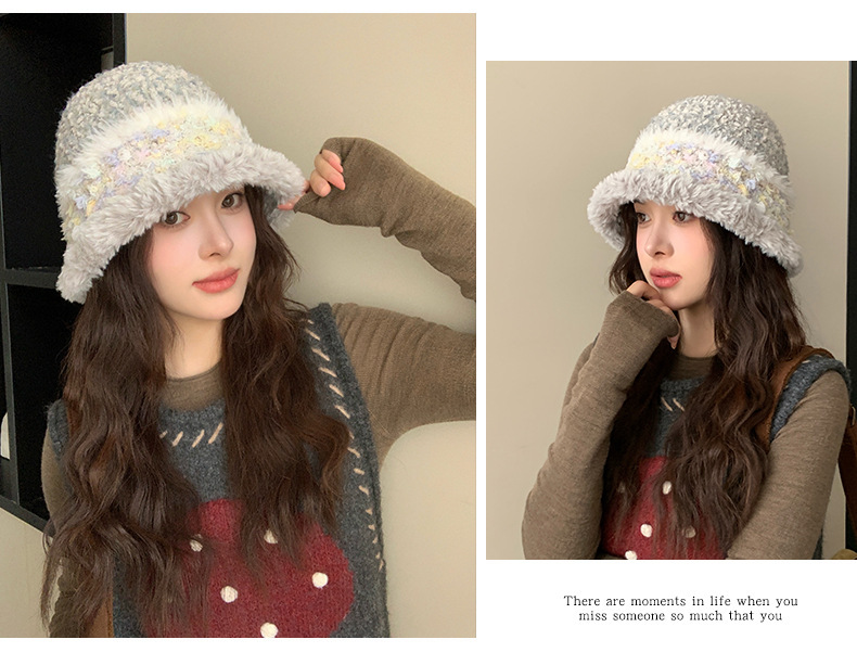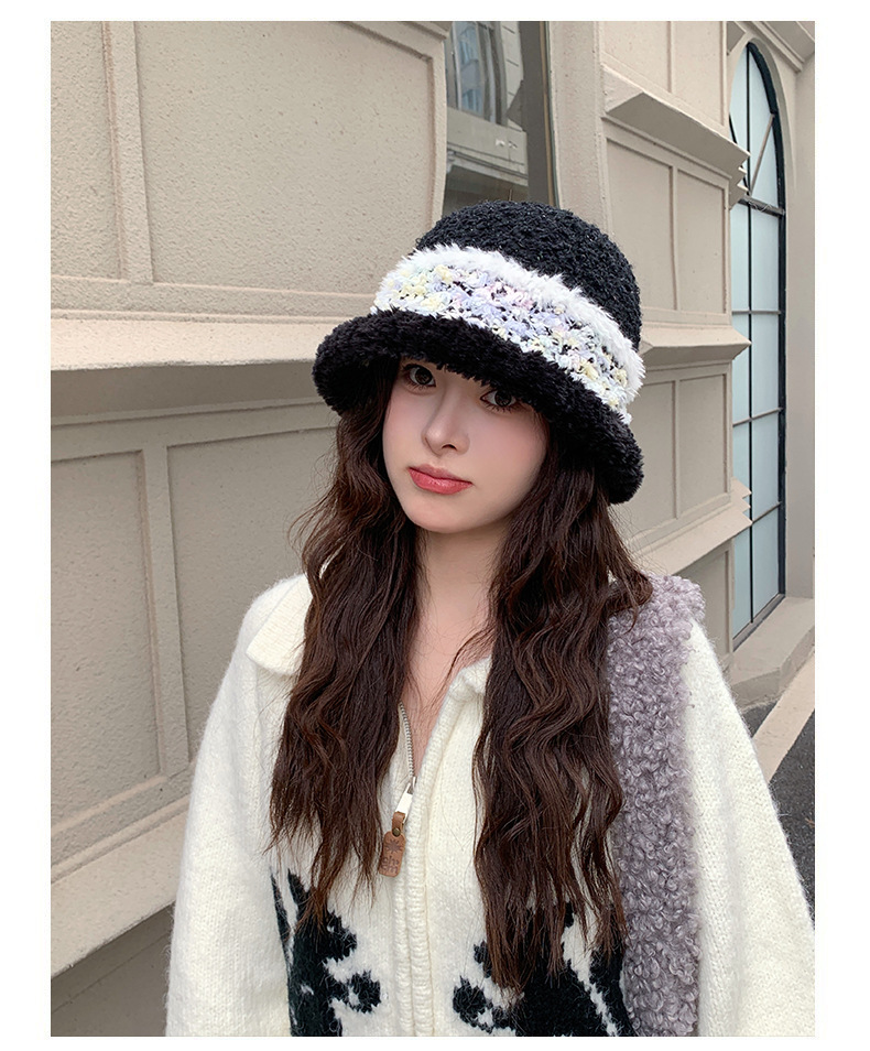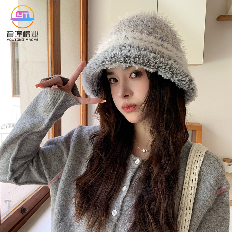新款高品质毛绒拼色水桶帽女韩版保暖护耳毛线帽子时尚出游盆帽潮