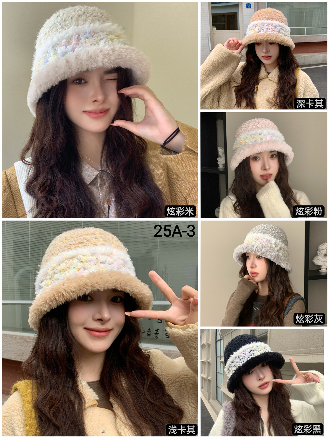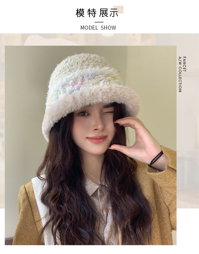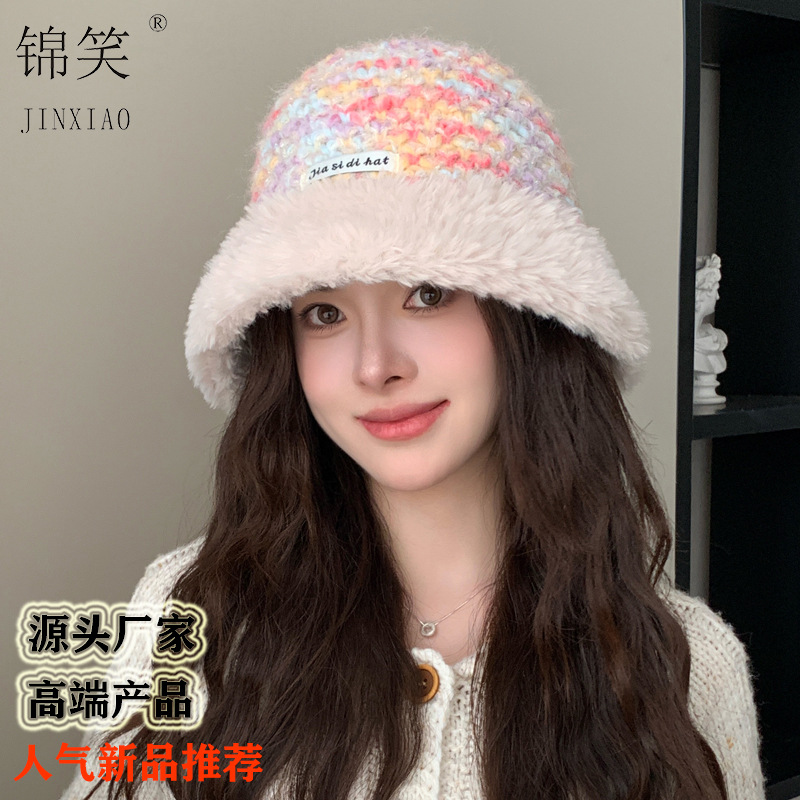 毛绒渔夫帽撞色彩虹多巴胺针织水桶帽秋冬保暖护耳毛线水桶帽子
