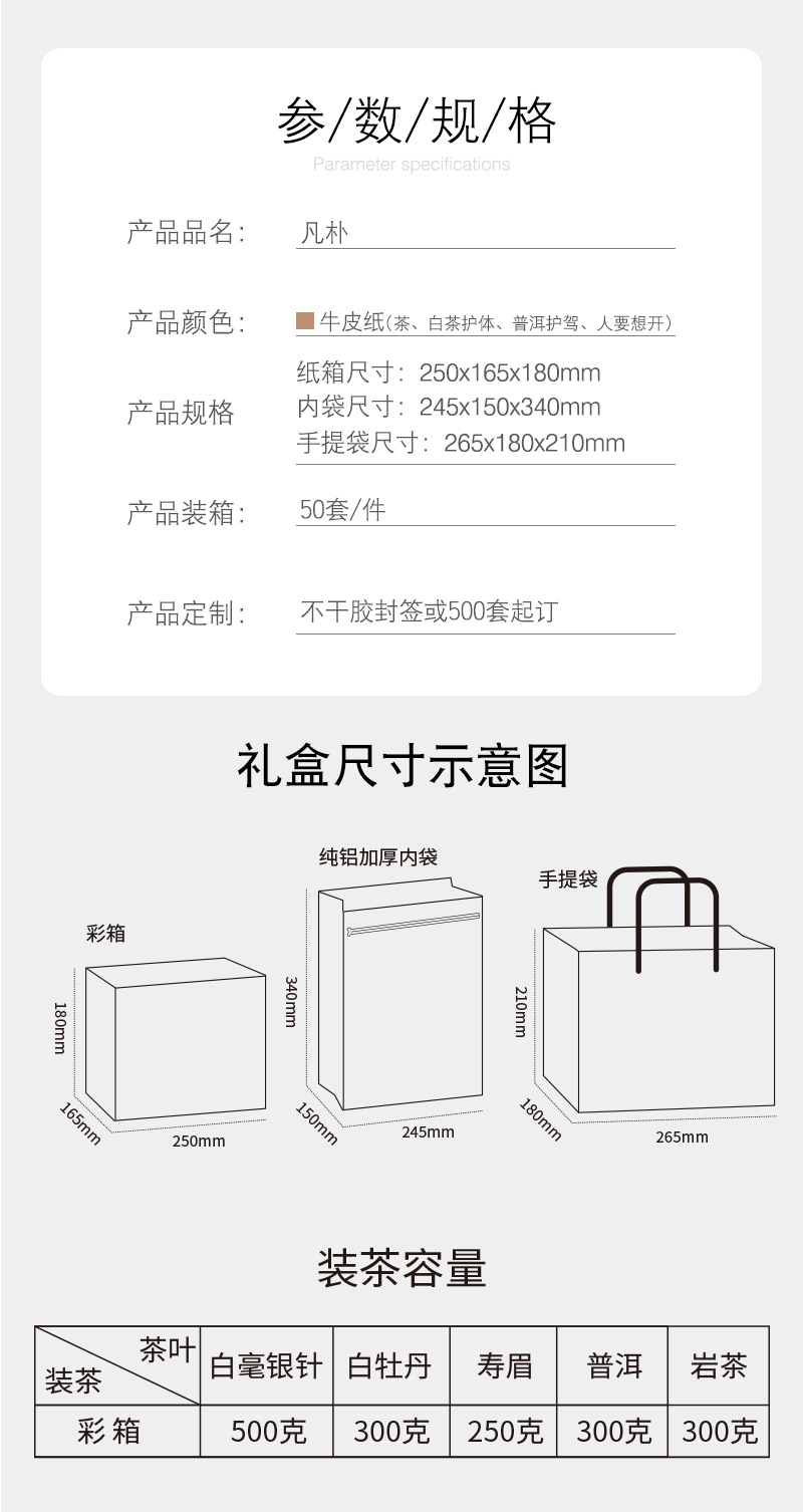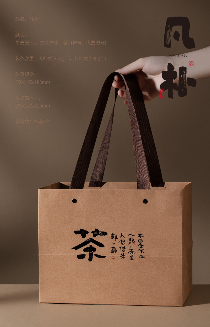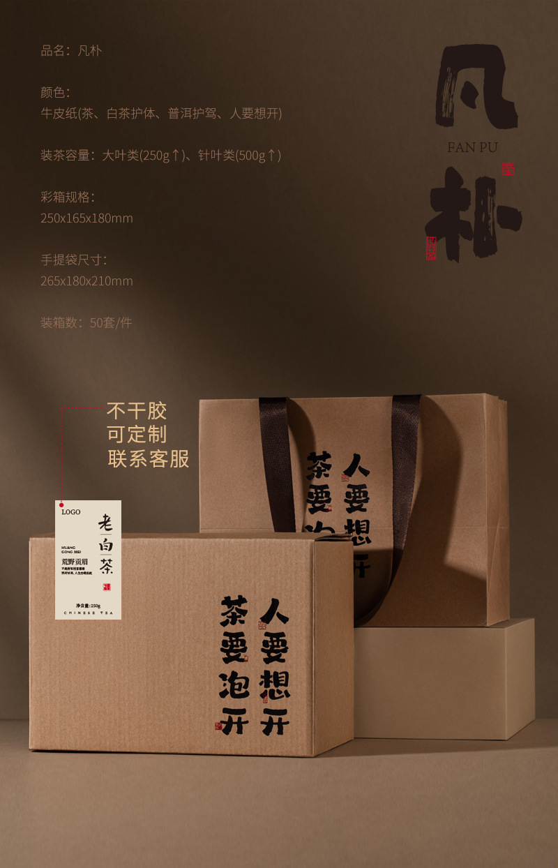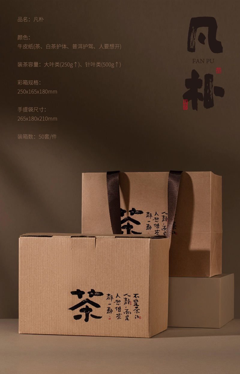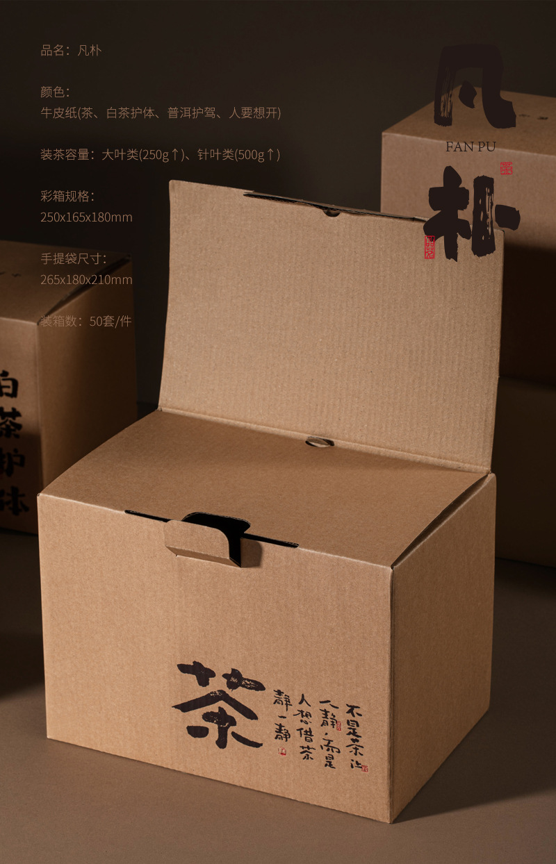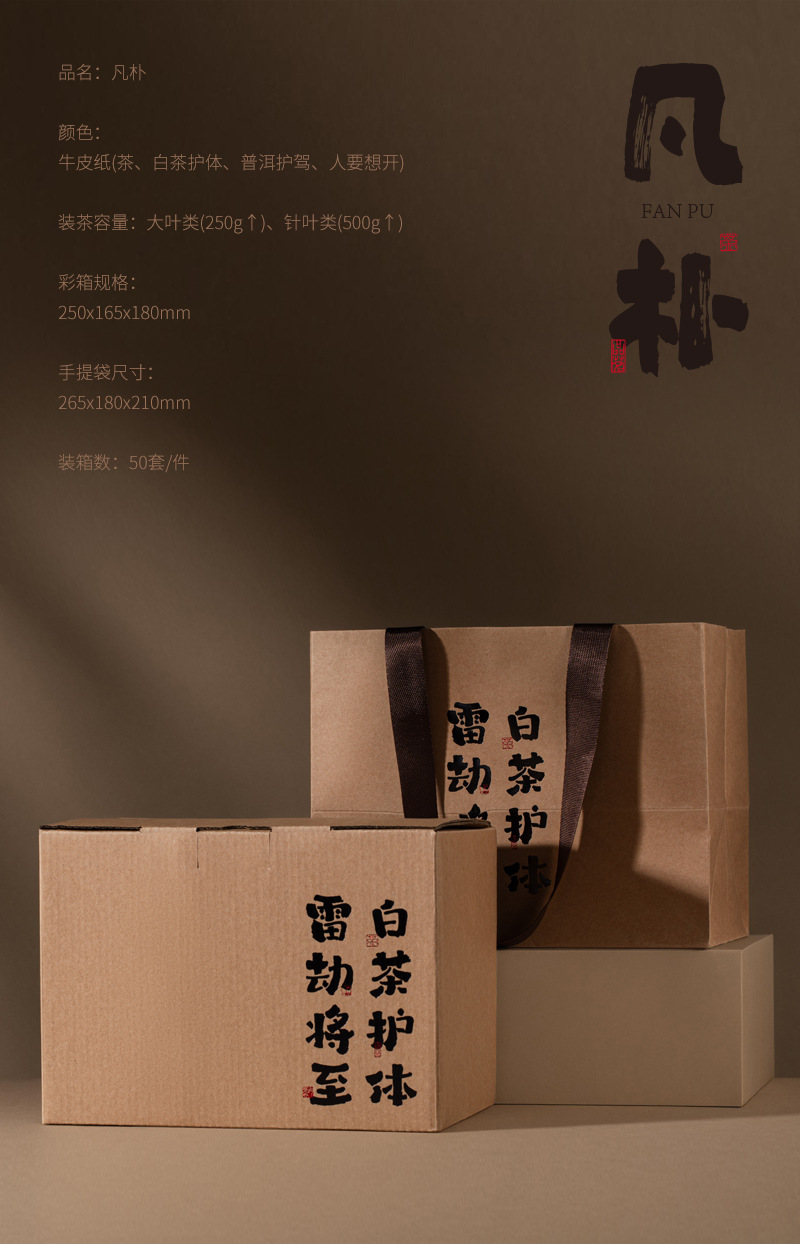 规格型号 凡朴牛皮纸箱(茶)套组-配内袋;250g,凡朴牛皮纸箱(白茶护体)套组-配内袋;250g,凡朴牛皮纸箱(普洱护驾)套组-配内袋;250g,凡朴牛皮纸箱(人要想开)套组-配内袋;250g