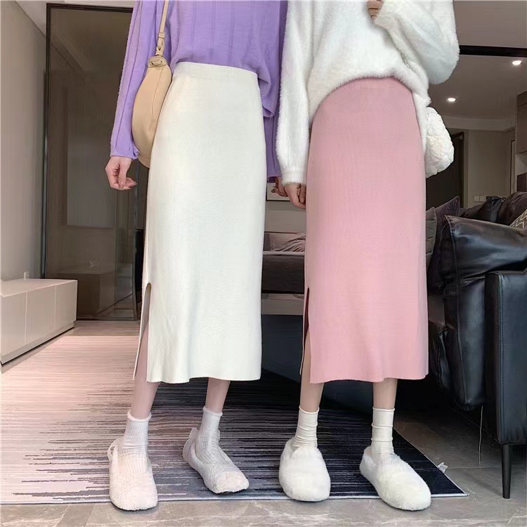外贸高腰针织裙女中长款直筒开叉半身裙秋冬气质高级感显瘦包臀裙