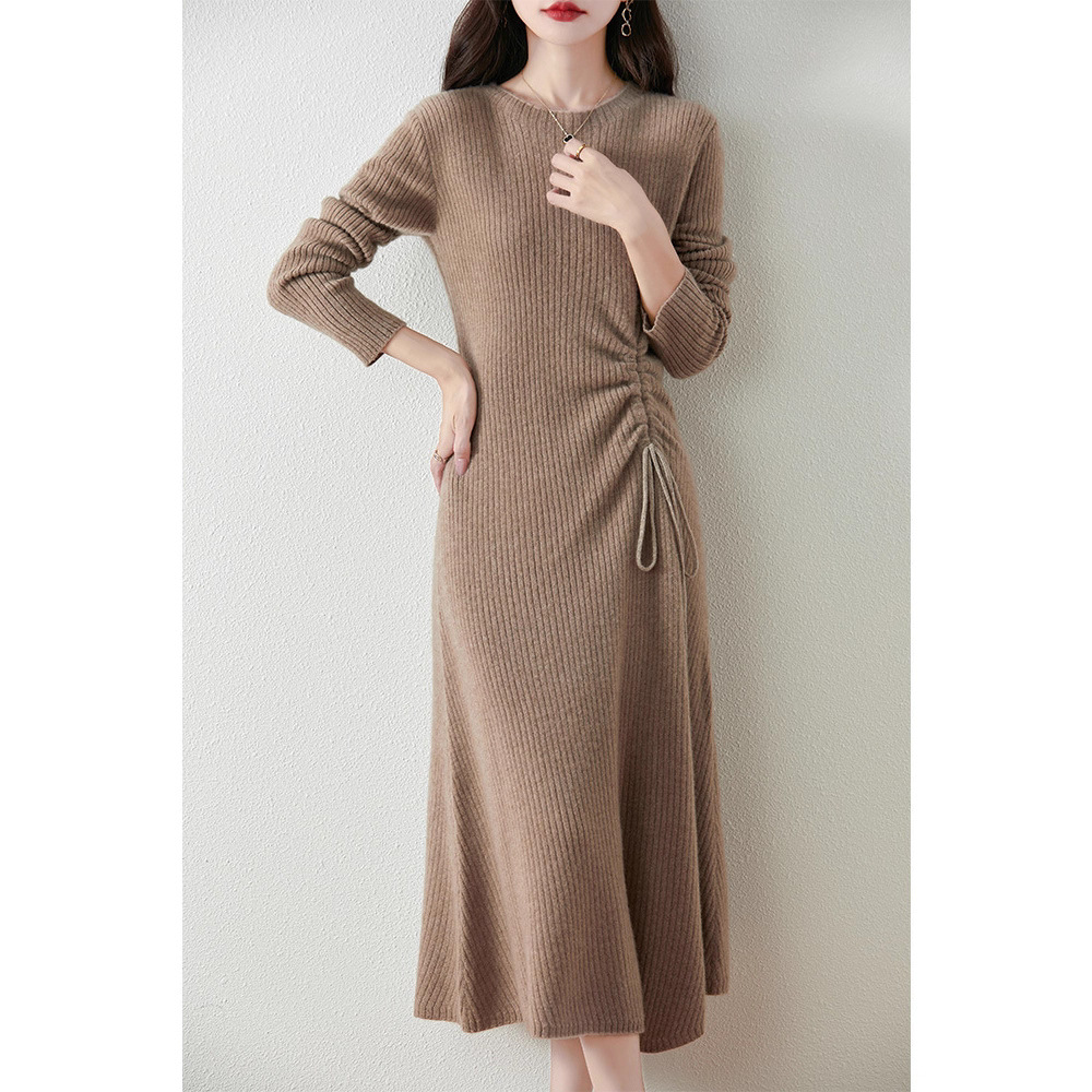 秋冬气质中长款过膝连衣裙女显瘦打底针织裙收腰抽绳过膝毛衣裙女