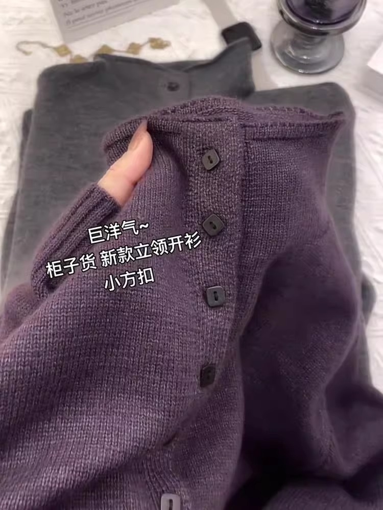 韩版洋气紫色立领方扣毛衣女年春季新款半高领设计感针织开衫