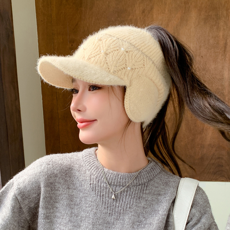 秋冬保暖护耳针织空顶帽女士洋气时尚韩版百搭冬季扎马尾鸭舌帽潮