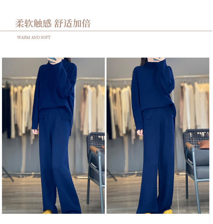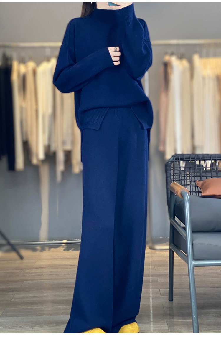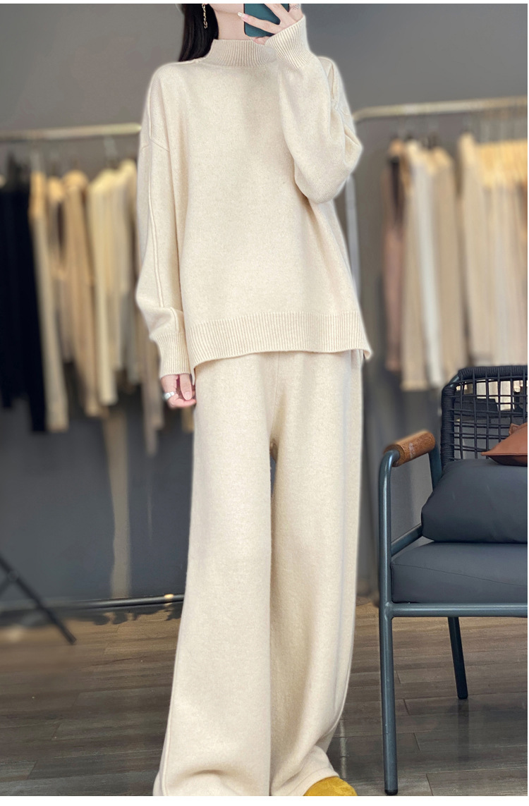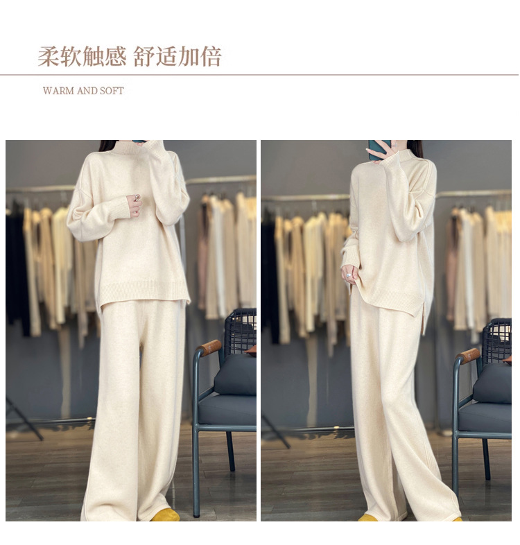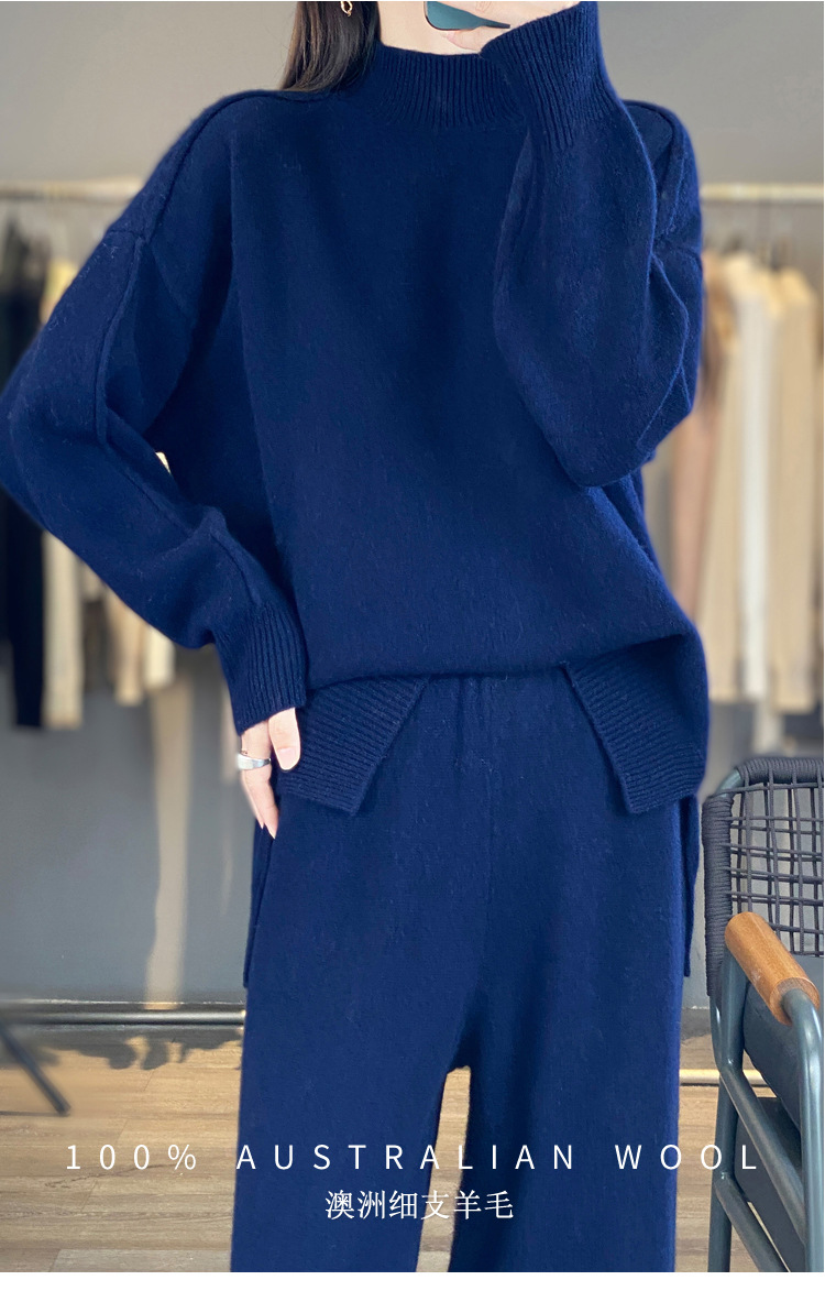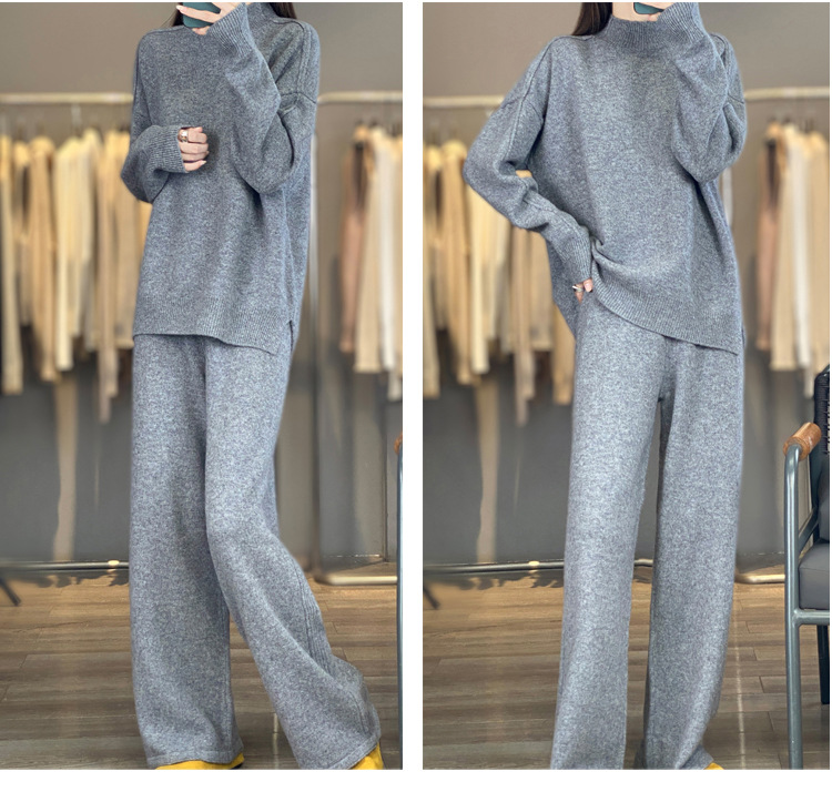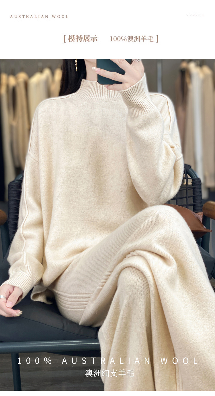 2025年秋冬新款半高领纯羊毛慵懒风针织衫长袖纯色高腰阔腿裤两件