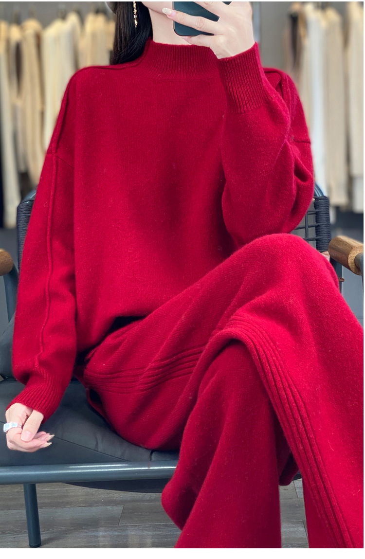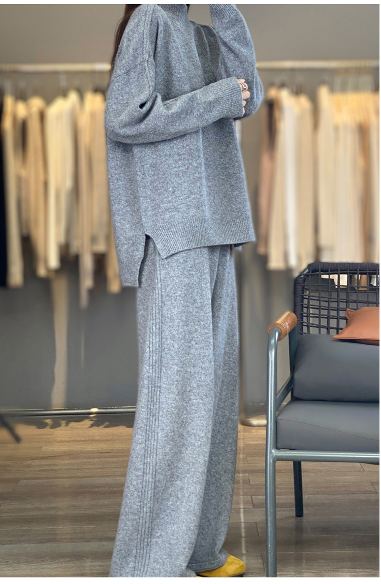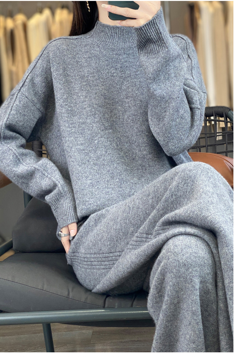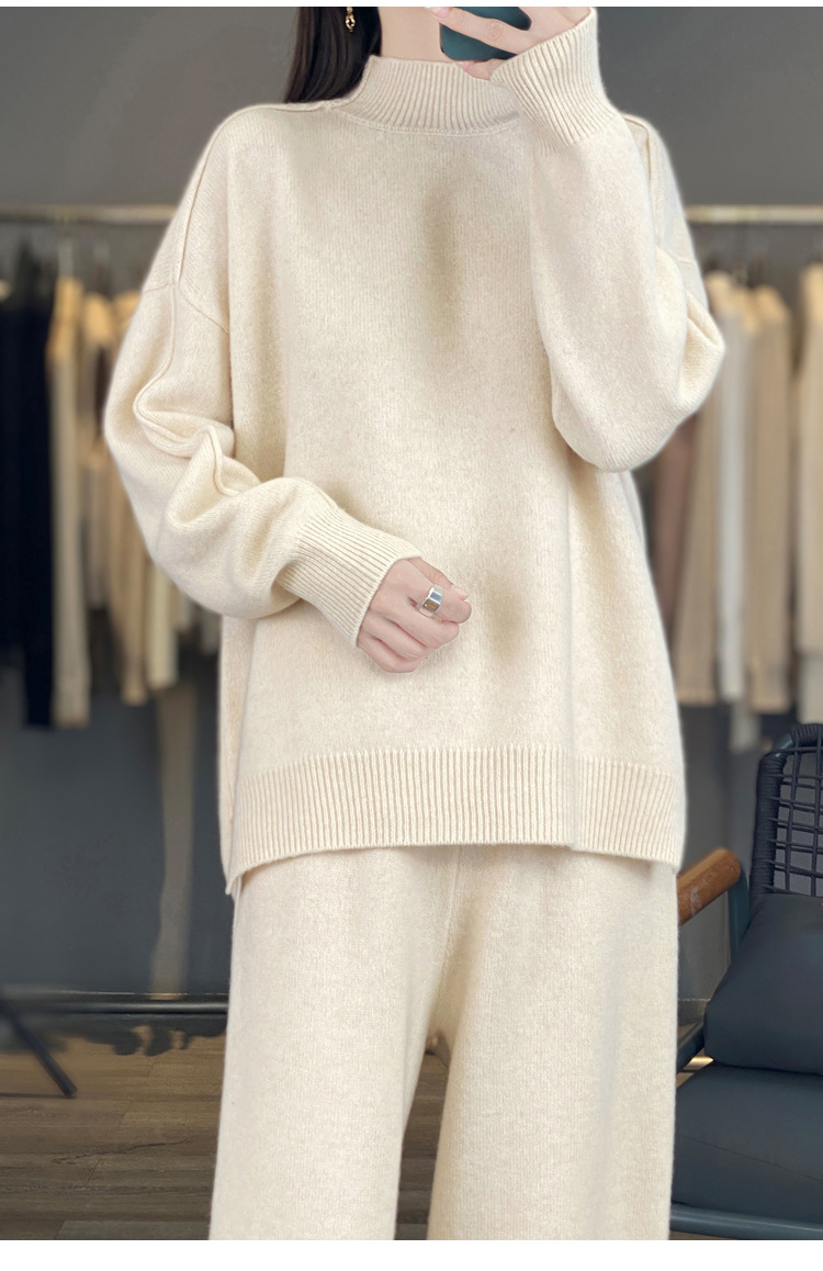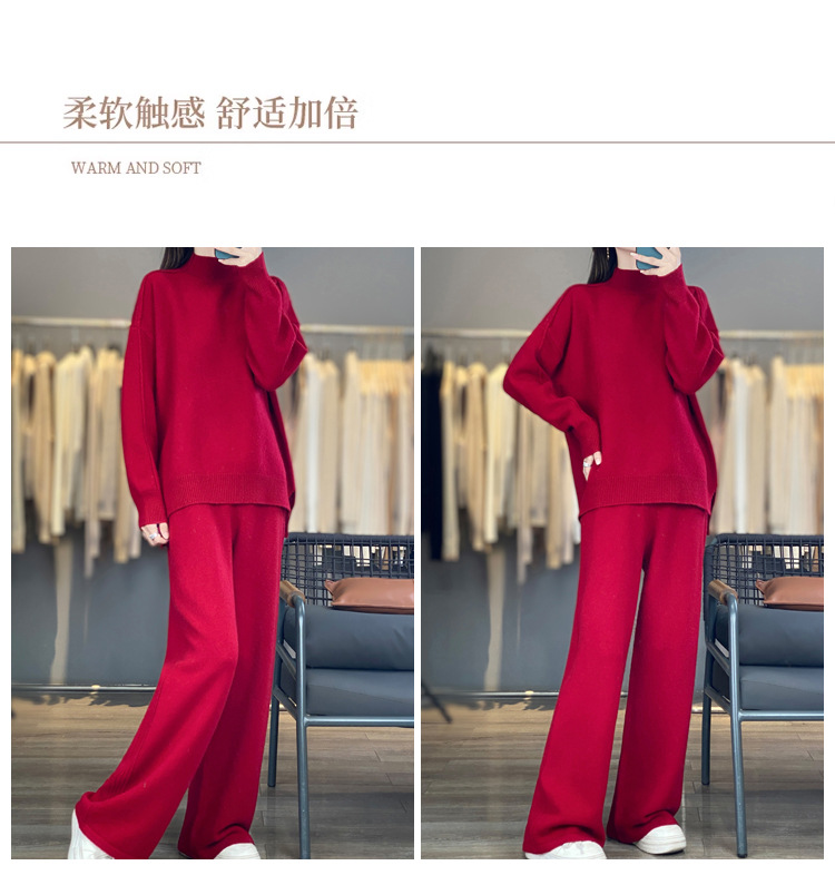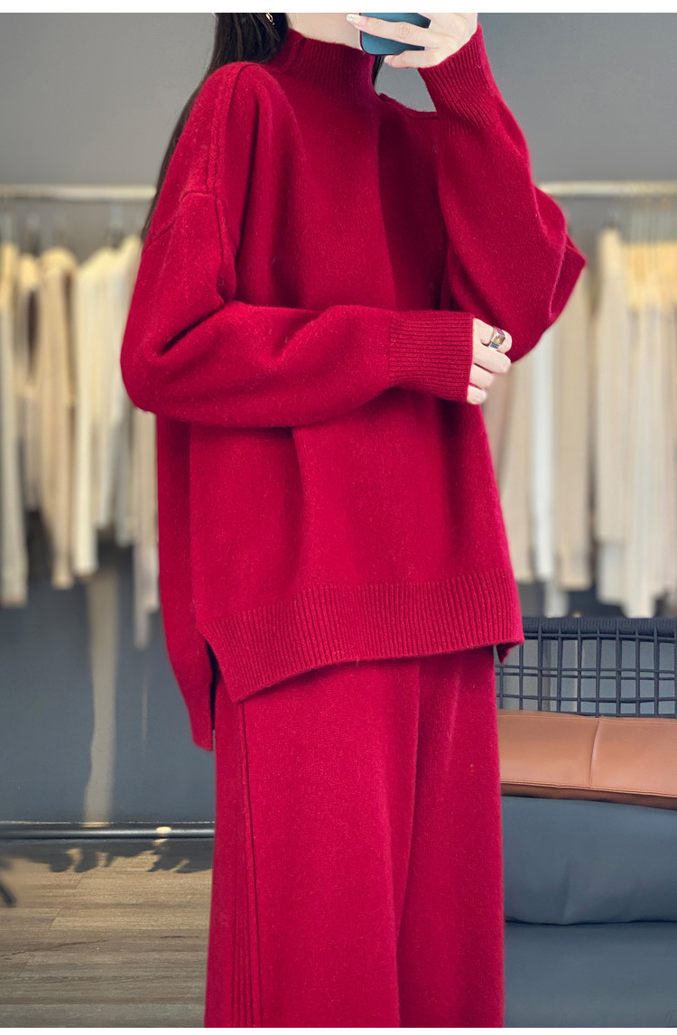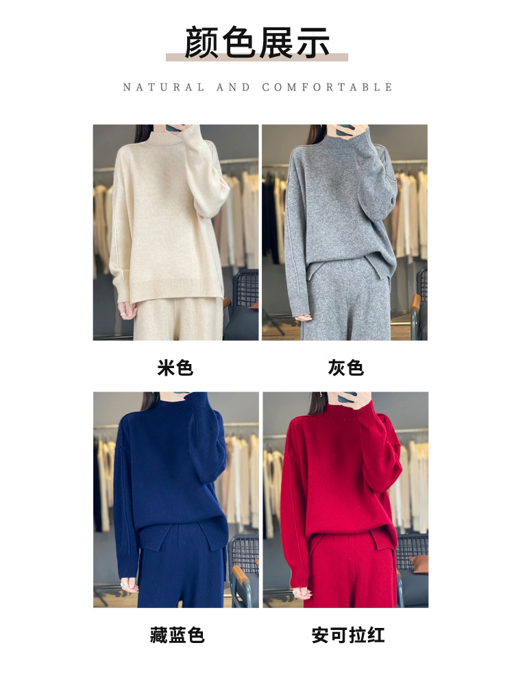 2025年秋冬新款半高领纯羊毛慵懒风针织衫长袖纯色高腰阔腿裤两件