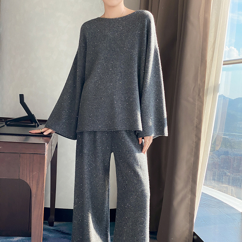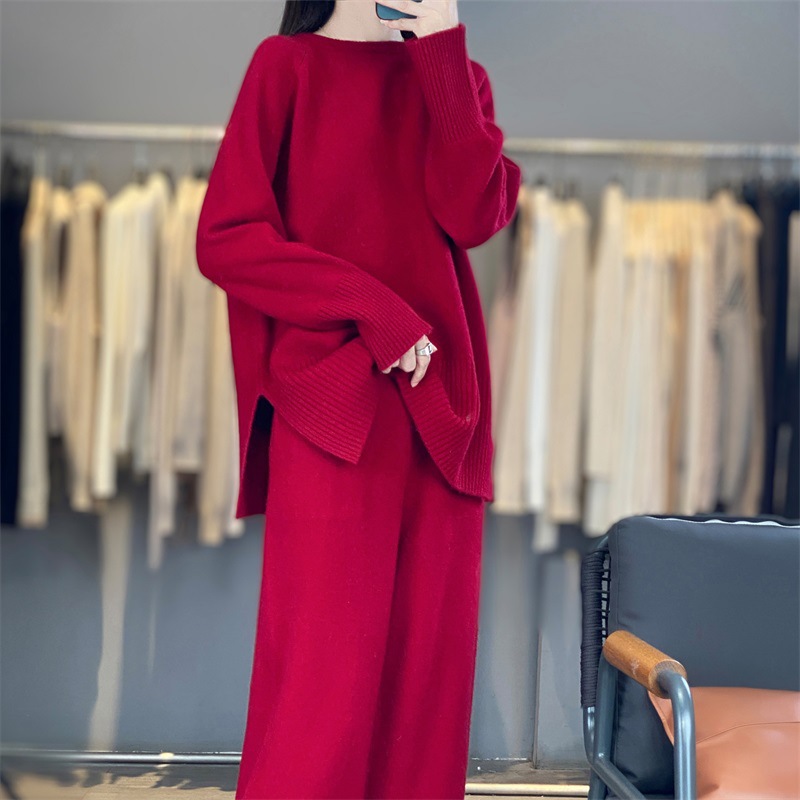 25秋冬新款羊绒针织套装女加厚圆领毛衣宽松阔腿裤时尚羊毛两件套