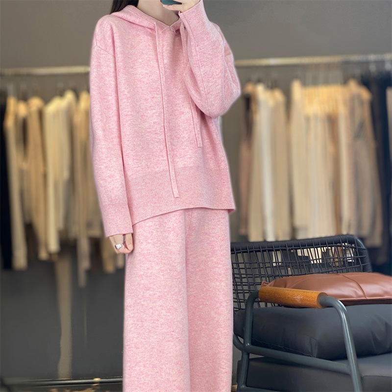 2025年空气层连帽羊毛毛衣女慵懒宽松阔腿裤两件套装洋气针织加厚