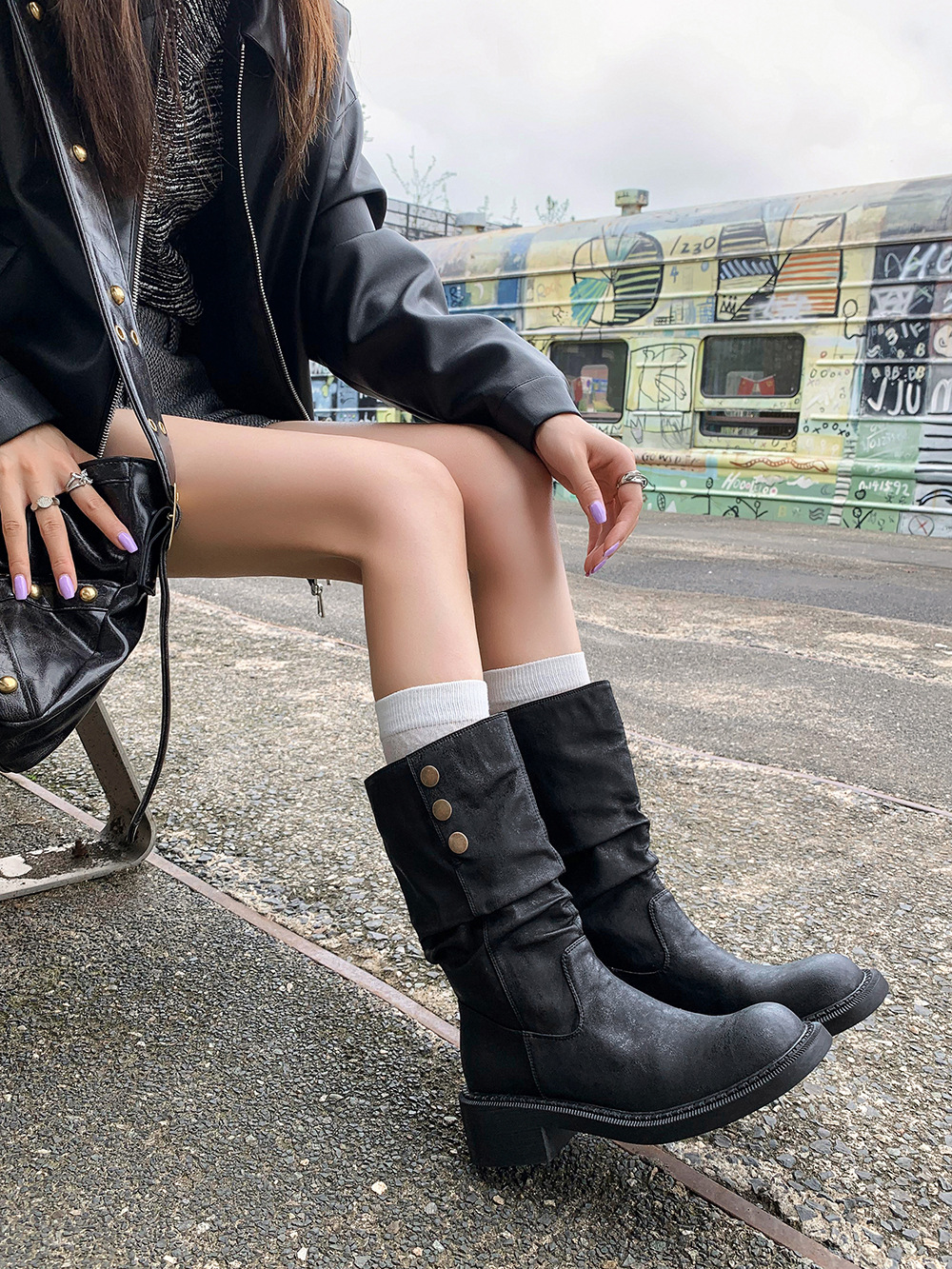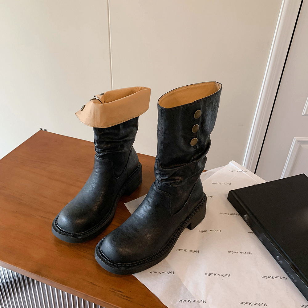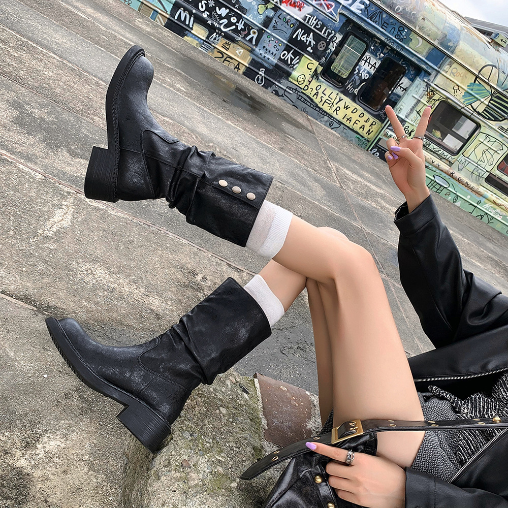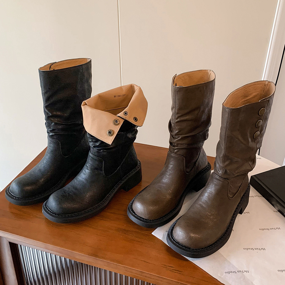 澜柜版~千语同款翻折三穿堆堆靴擦色复古粗跟高筒靴不过膝长靴
