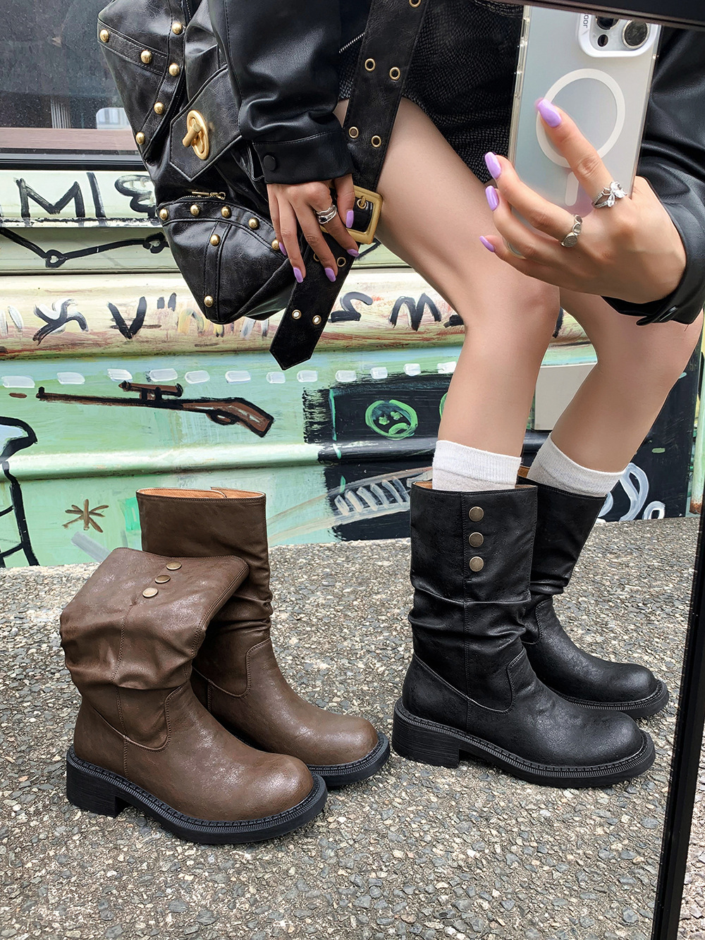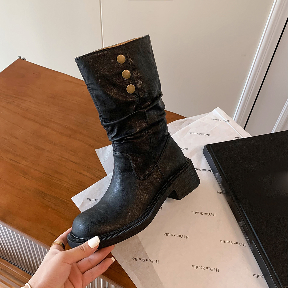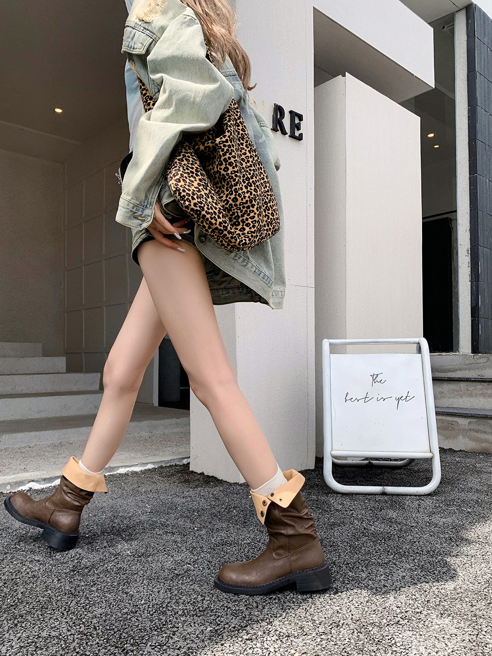 澜柜版~千语同款翻折三穿堆堆靴擦色复古粗跟高筒靴不过膝长靴