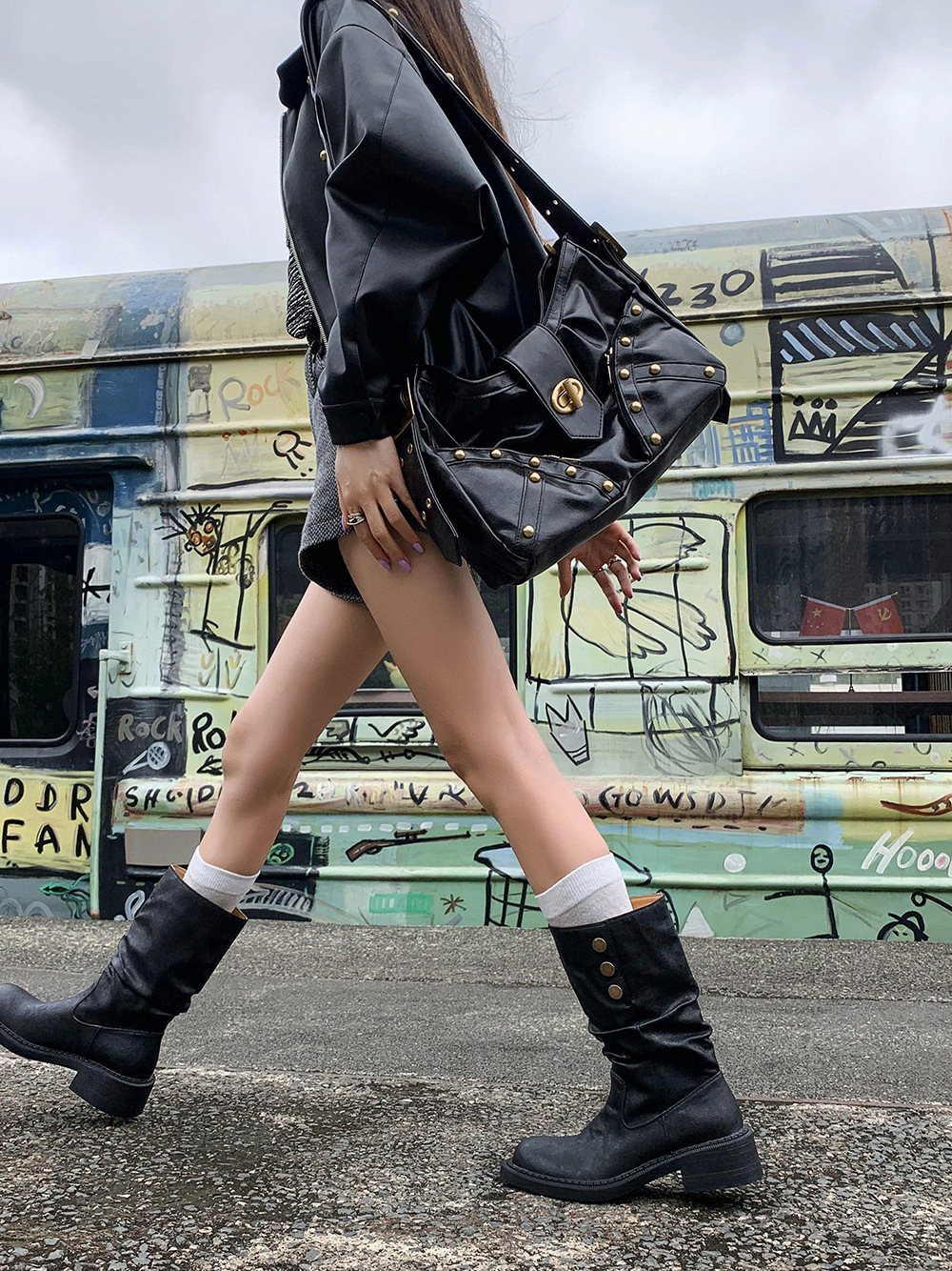 澜柜 女鞋手抓纹沁色2025新款油蜡质感皮带扣机车短靴重工骑士靴