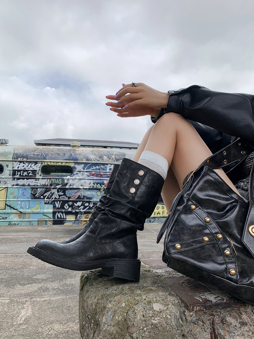 澜柜版~内增高辣妹裤管靴擦色复古时髦废土风褶皱扣带西部短靴女