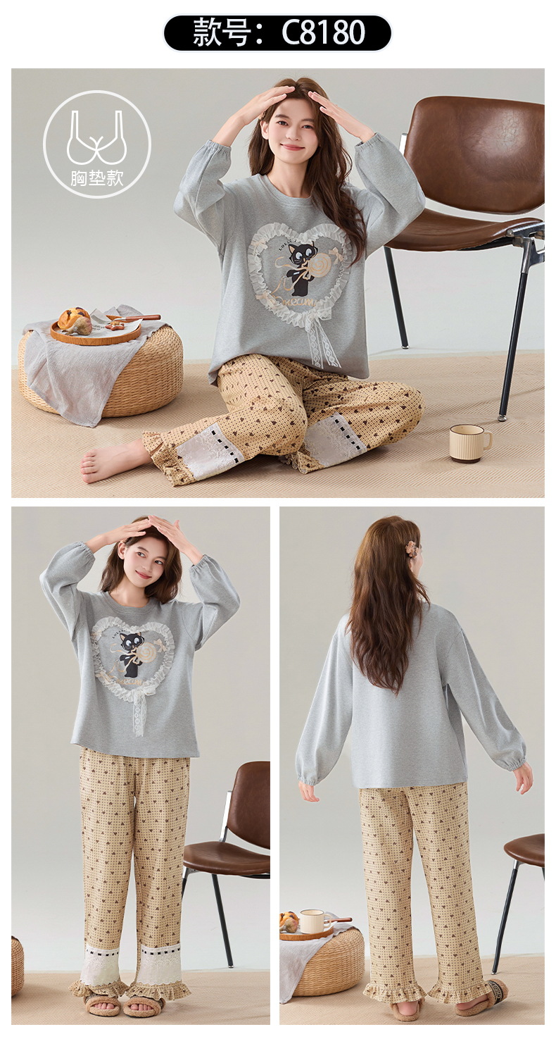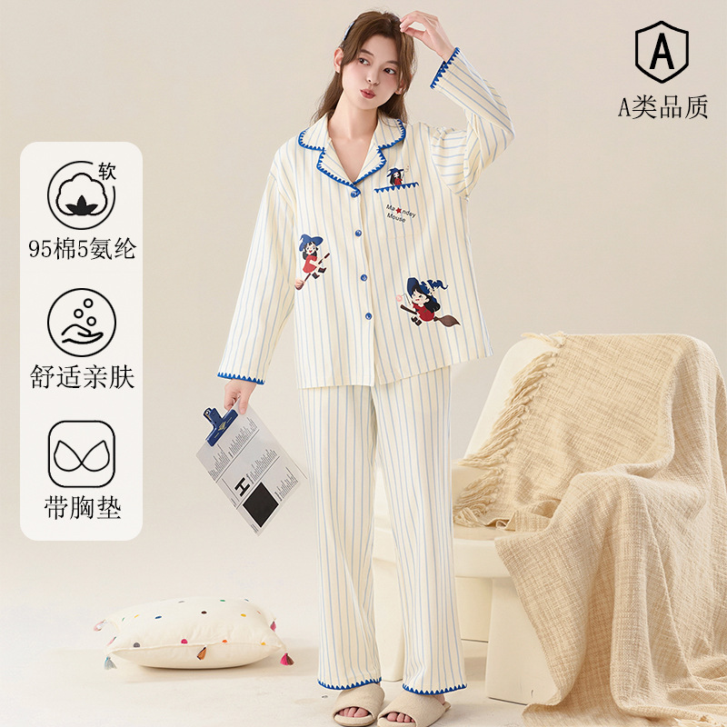 95棉带胸垫女士秋冬季纯棉长袖开衫女生卡通拉架爽棉家居服女套装