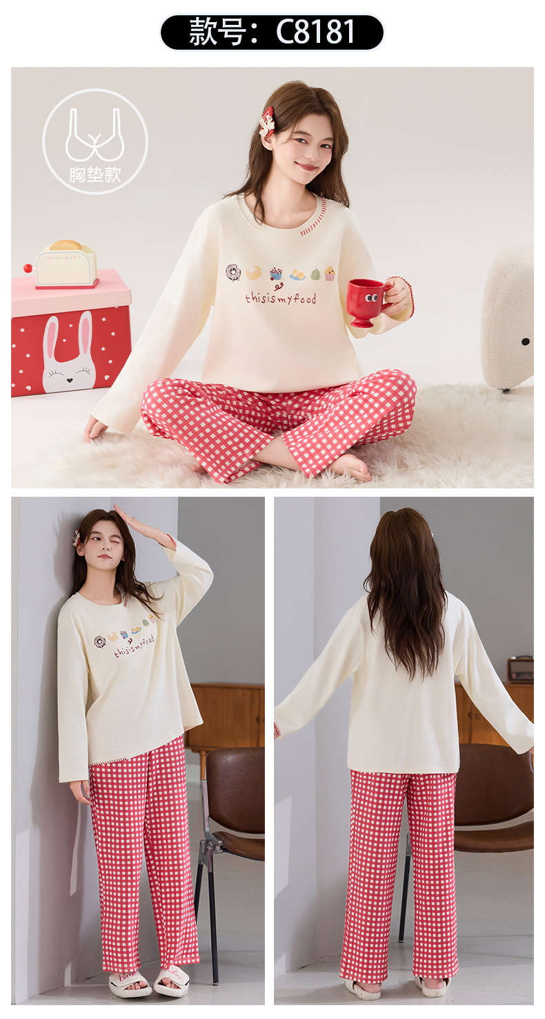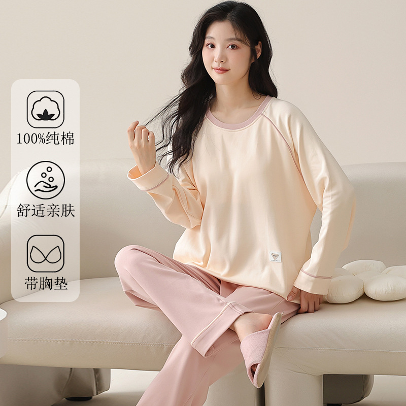 带胸垫睡衣女士秋冬季纯棉长袖长裤女生休闲可外穿全棉家居服套装