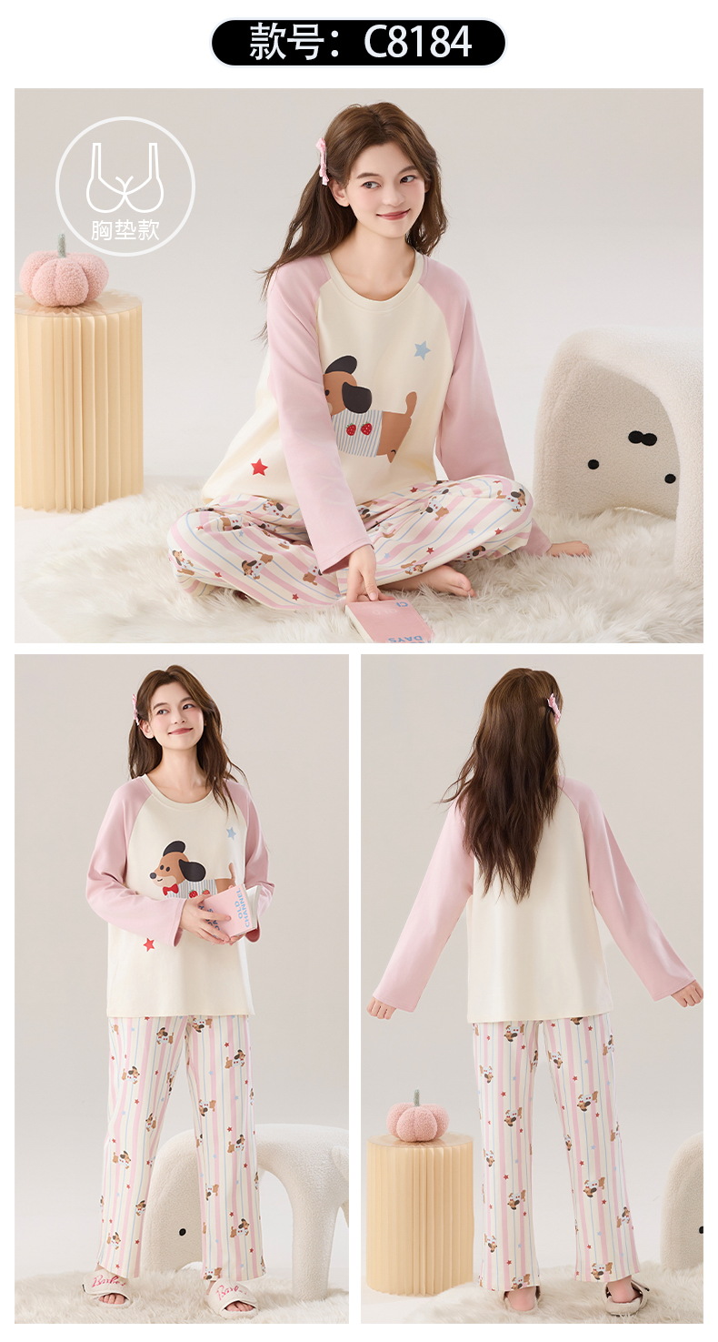A类95棉带胸垫睡衣女秋冬季纯棉长袖女士卡通大码拉架爽棉家居服
