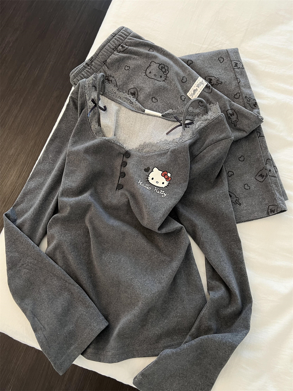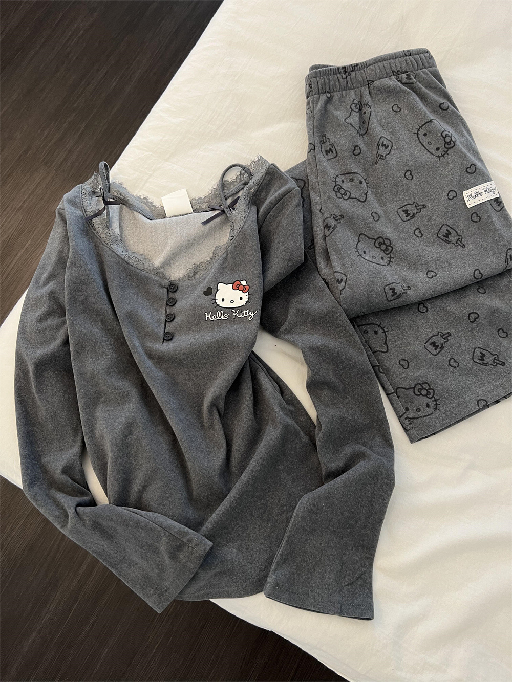 韩版可爱假两件HelloKitty印花睡衣女春秋季长袖长裤家居服两件套