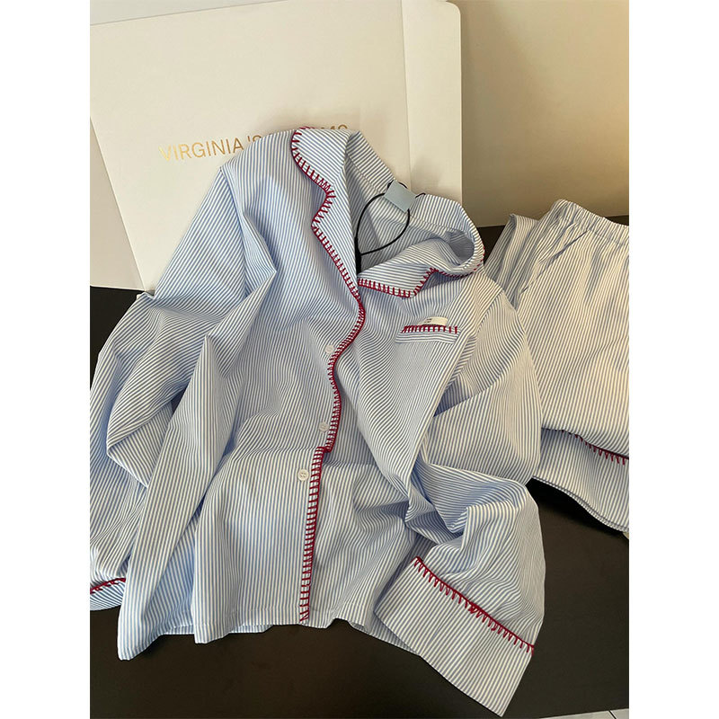 韩系轻奢蓝白条纹睡衣女2025春秋季慵懒感宽松长袖长裤家居服套装