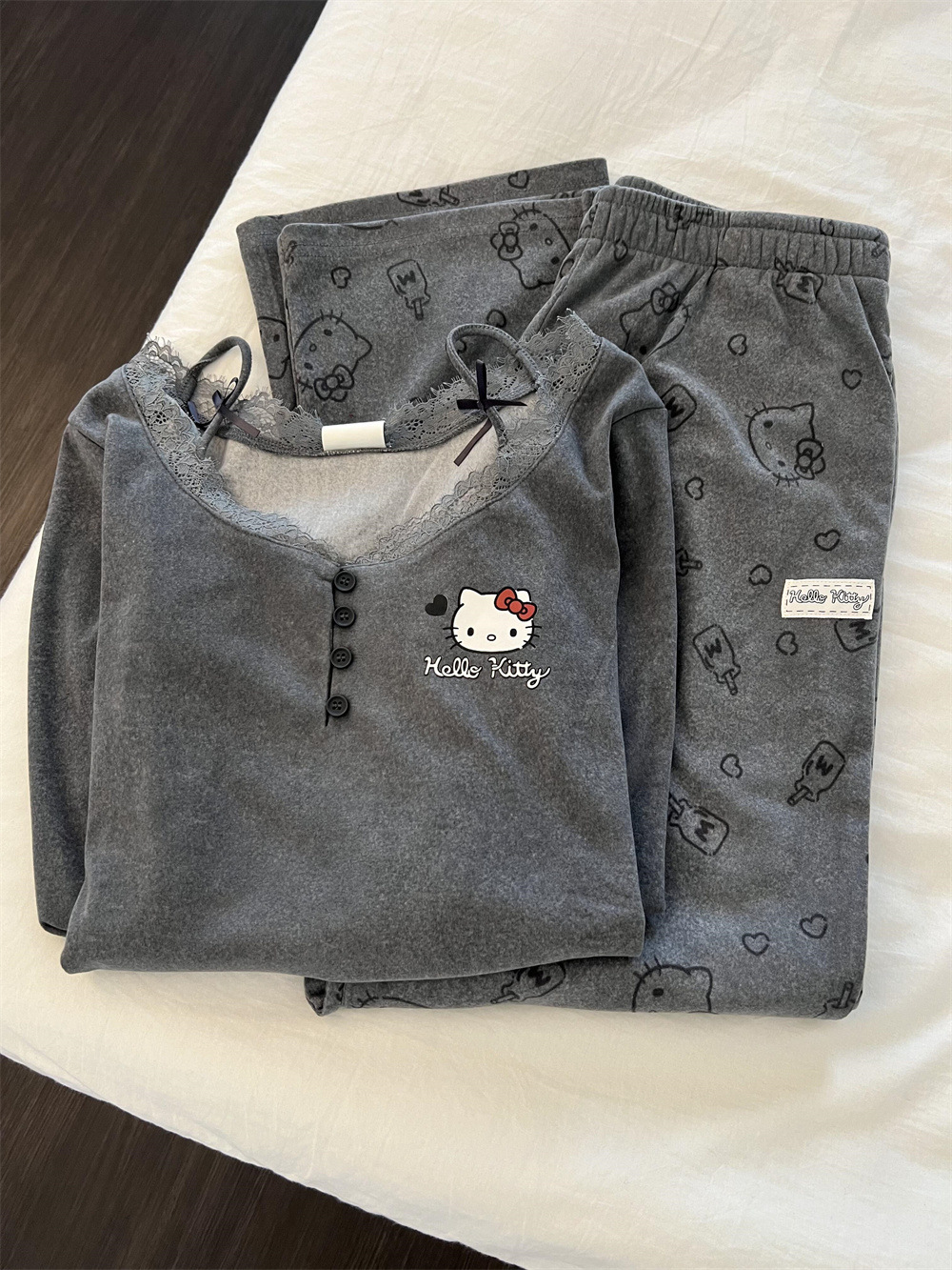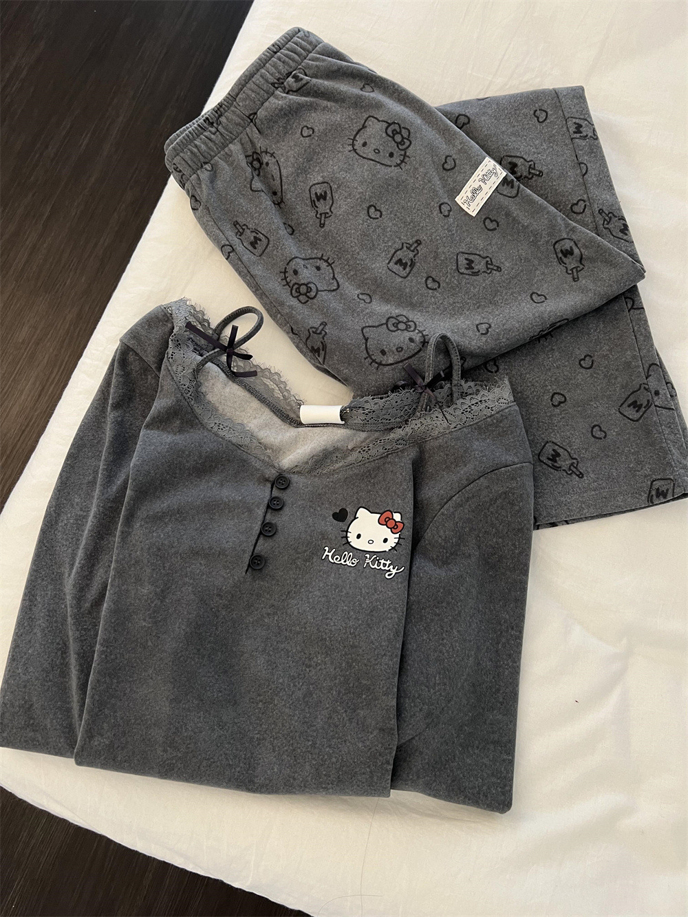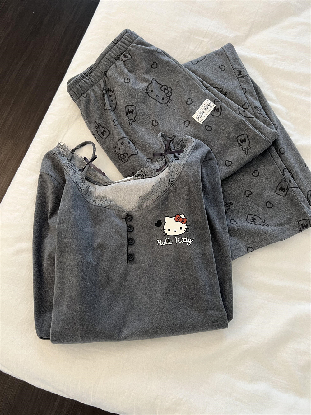 韩版卡通kitty猫蕾丝睡衣女2025春秋季新款长袖长裤家居服套装ins