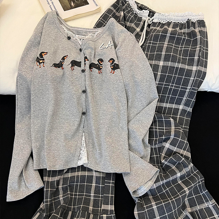 少女感可爱小狗印花睡衣女秋季甜美蕾丝花边长袖可外穿家居服套装