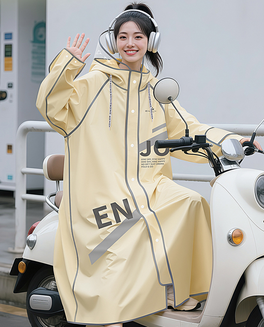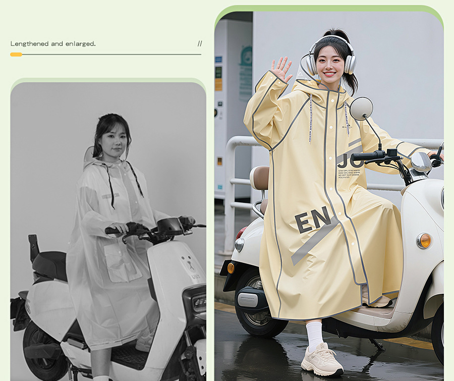 美しいレインコートを備えています。女性は長いタイプの全身防豪雨電気自動車を着ています。