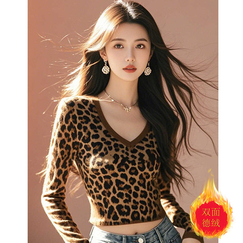 秋冬アメリカ風ギャル豹紋ショートタイプの襟徳絨毛保温tシャツの底のシャツの女性の中にデザイン感のある長袖の上着を掛けます。