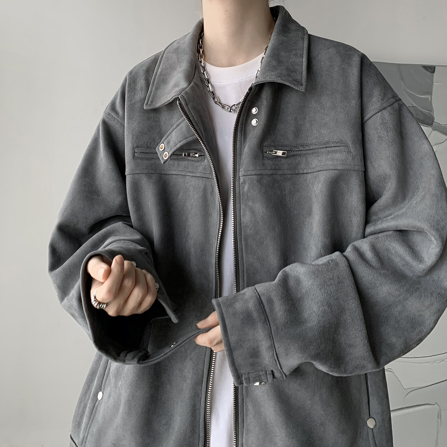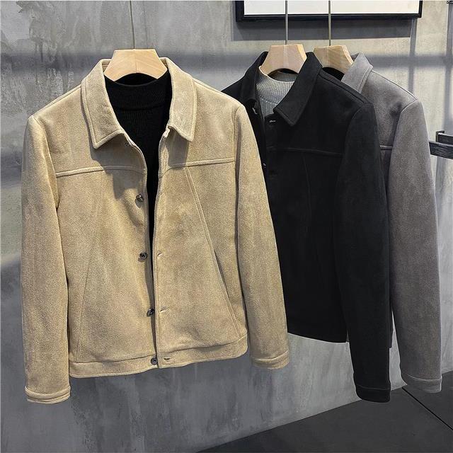 版型巨好重磅麂皮绒秋冬男士防风翻领休闲多口袋工装夹克外套