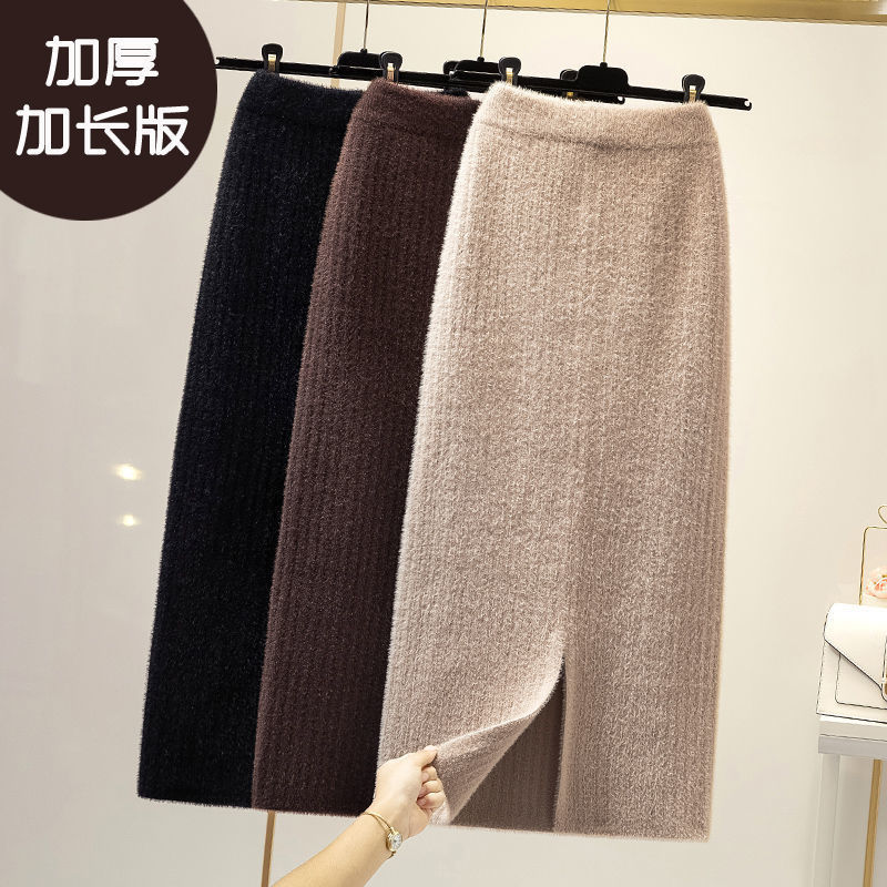 秋冬の女性用の非常に長く厚みのあるミンクベルベットスカート、新しいミドル丈スリットワンステップスカート、ニットヒップカバースカート、ロングスカート